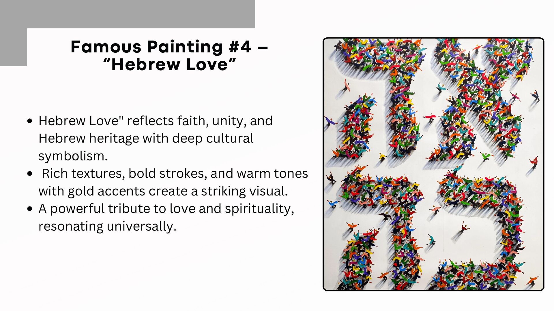 unity, and Hebrew heritage with deep cultural symbolism. Rich textures, bold strokes, and warm tones with gold accents create a striking visual. A powerful tribute to love and spirituality, resonating universally.