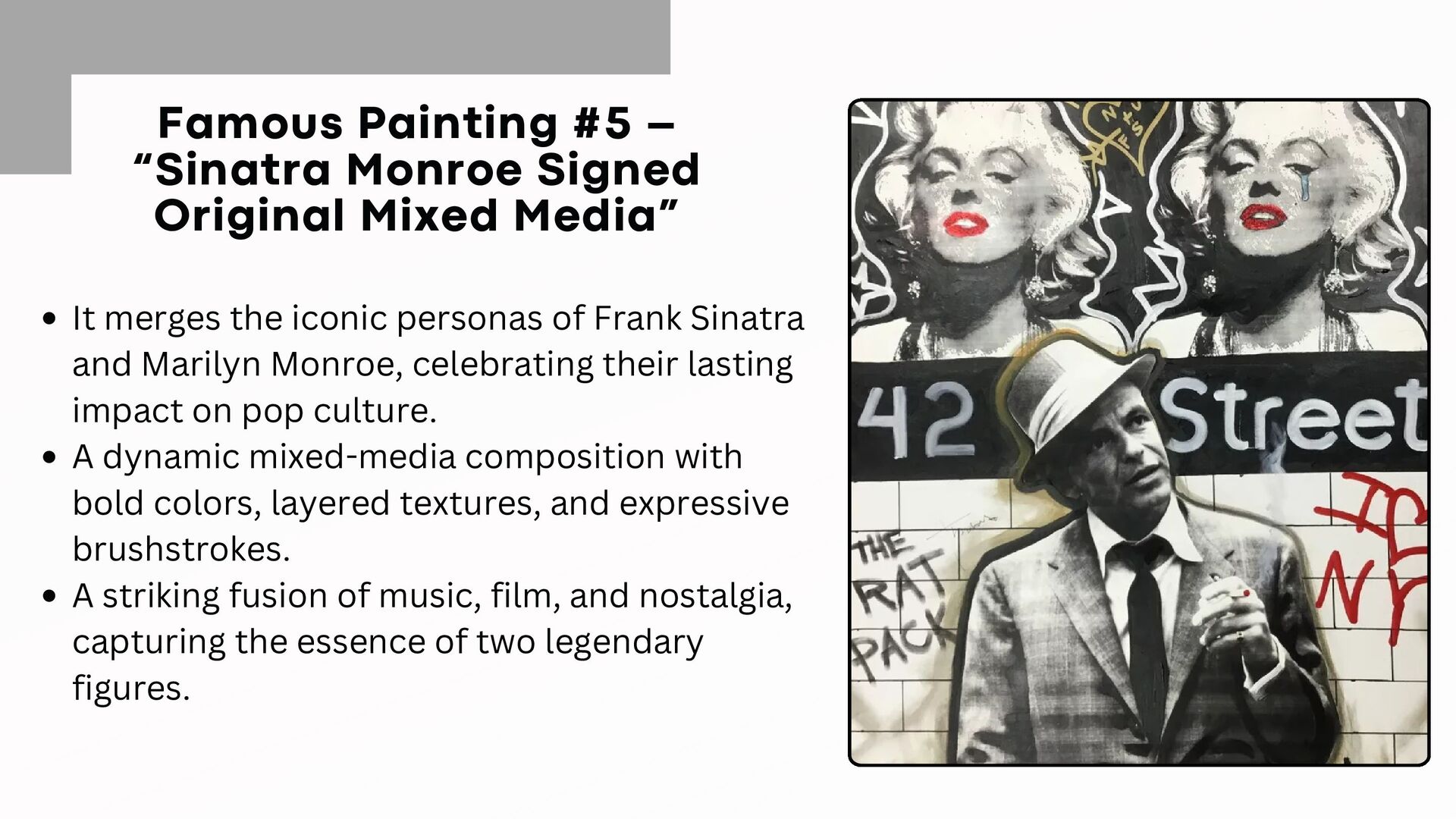 It merges the iconic personas of Frank Sinatra and Marilyn Monroe, celebrating their lasting impact on pop culture. A dynamic mixed-media composition with bold colors, layered textures, and expressive brushstrokes. A striking fusion of music, film, and nostalgia, capturing the essence of two legendary figures.