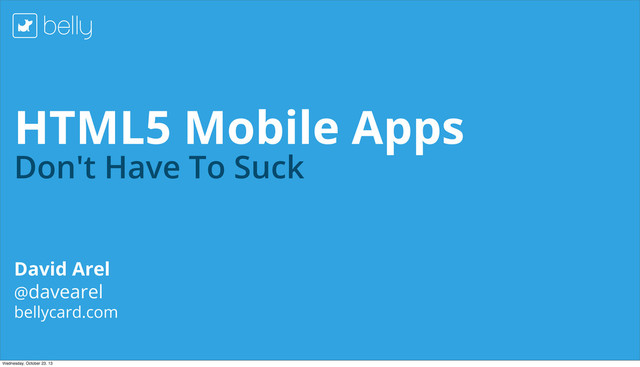 Sometimes, you've got to rock the boat to keep it from sinking. Belly's decision to scrap their native iPad app and build an HTML5 app was a risky move but proved to be one of the best decisions the startup has made. While mobile web is considered a harsh environment with low processing power, a few key techniques can be used to get the best performance out of your application. Belly's unique deployment platform, built on Phonegap's mobile framework, enables instantaneous software updates to any or all devices; making A/B testing a breeze. In this talk, Dave Arel will discuss how to build fast, proficient, native-like HTML5 mobile applications, and the enormous benefit it surely brings.