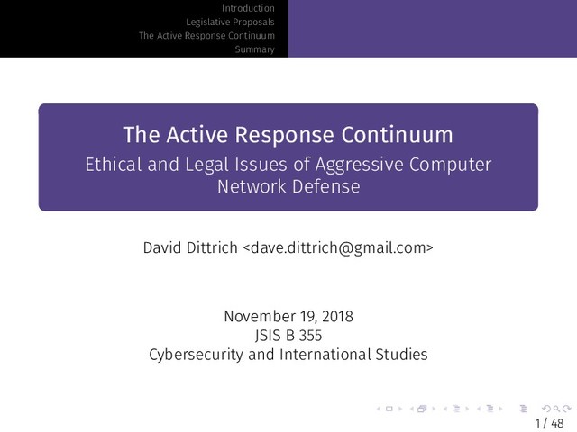 This talk discusses some of the computer intrusion sets that drive discussions of "active defense" ("hacking back"), including Mandiant's APT1 report (and their response), Citizen Lab's "Tracking Ghostnet" report, and the Georgian CERT's "Georbot" report. We then explore some common ethical philosophies, "integrity," "just war" doctrine, ACM's Code of Ethics, and the "Common Rule." We look at some legislative proposals (Berman/Coble, the Active Cyber Defense Certainty Act, and Georgia Senate Bill 315. Lastly, we discuss the Active Defense Continuum.