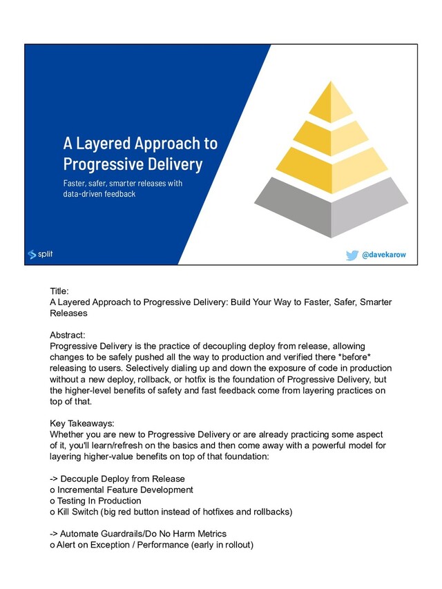 Whether you are new to Progressive Delivery or are already practicing some aspect of it, you'll learn/refresh on the basics and then come away with a powerful model for layering higher-value benefits on top of that foundation: