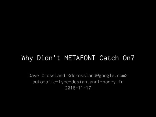 This presentation addressed the history of METAFONT, largely presenting my TUG Conference 2008 presentation (https://www.youtube.com/watch?v=zwPObPbk90I) that was also published as TUGBoat paper, https://www.tug.org/TUGboat/tb29-3/tb93crossland.pdf