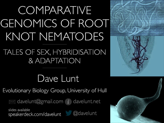 Group, University of Hull COMPARATIVE GENOMICS OF ROOT KNOT NEMATODES @davelunt speakerdeck.com/davelunt slides available [email protected] davelunt.net