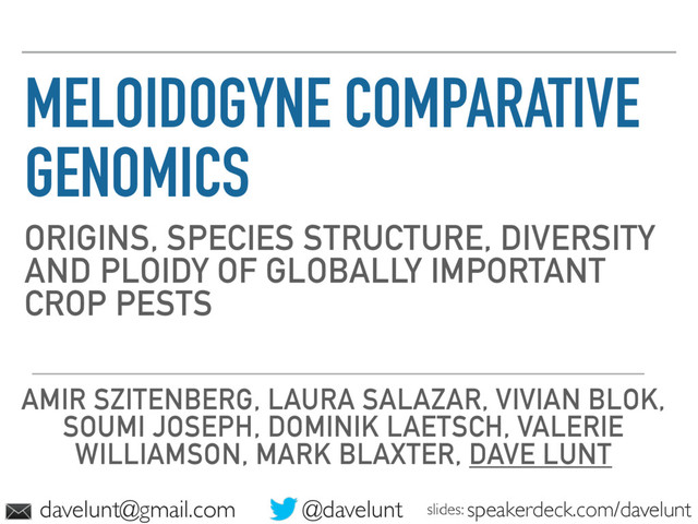 BIRD, ETIENNE DANCHIN, PHILIPPE CASTAGNONE-SERENO, BOB ROBBINS, PABLO CASTILLO & MANY MANY OTHERS @davelunt [email protected] speakerdeck.com/davelunt slides available data accession: PRJNA340324 Amir Szitenberg & Laura Salazar have carried out most of this work