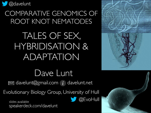 Group, University of Hull COMPARATIVE GENOMICS OF ROOT KNOT NEMATODES @davelunt speakerdeck.com/davelunt slides available [email protected] davelunt.net @EvoHull