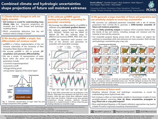 [email protected] 1) Climate-driven changes to soils are highly uncertain This work was supported by the U.S. Department of Energy, Office of Science, Biological and Environmental Research Program, Earth and Environmental Systems Modeling, MultiSector Dynamics under Cooperative Agreement DE-SC0022141. This work was partially supported by the Thayer School of Engineering at Dartmouth College. Any findings or recommendations expressed in this material are those of the author(s). • Soil moisture is crucial for understanding many climate risks, but long-term projections are uncertain due to both climate and hydrologic modeling factors. • Which uncertainties determine how key soil moisture metrics change in future? Fig. 1: Schematic representation of major water flux and storage components within pyWBM. [1] Grogan et al. (2022), Water balance model (WBM) v.1.0.0: a scalable gridded global hydrologic model with water-tracking functionality, Geosci. Model Dev. [2] Xia et al. (2014). Evaluation of multi-model simulated soil moisture in NLDAS-2, J. Hydrology. [3] Reichle et al. (2019), Version 4 of the SMAP Level-4 Soil Moisture Algorithm and Data Product. J. Adv. Model. Earth Sys. [4] Pierce et al. (2023), Future Increases in North American Extreme Precipitation in CMIP6 Downscaled with LOCA. J. Hydrometeor. David Lafferty1*, Danielle Grogan2, Shan Zuidema2, Atieh Alipour3†, Iman Haqiqi4, Ryan Sriver1, Klaus Keller3 1University of Illinois, 2University of New Hampshire, 3Dartmouth College, 4Purdue University, *now at Cornell University, †now at NOAA Combined climate and hydrologic uncertainties shape projections of future soil moisture extremes • pyWBM is a Python implementation of the soil moisture submodule of the University of New Hampshire Water Balance Model [1]. • We encode pyWBM in JAX to provide JIT- compilation and automatic differentiability. • We use a simple 1d representation of water fluxes within the active soil layer. Uncertain parameters include: 𝛼 (controls evapotranspiration) 𝛽R (controls runoff) wiltingp (wilting point) awCap (water capacity of the active layer) • We leverage the differentiability of pyWBM to calibrate using mini-batch gradient descent. • We calibrate against NLDAS-2 outputs [2] (VIC, MOSAIC, NOAH) and the SMAP L4 dataset [3]. We also calibrate using 13 different loss functions (RMSE, MSE, KGE, etc). • pyWBM can reproduce each product over most of the domain and generates an ensemble with reasonable coverage. • Sampling relevant climate and hydrologic uncertainties is crucial for understanding future hydroclimate risks. • Soil moisture is often an intermediate variable to downstream models of more societally-relevant outcomes––how do these uncertainties propagate to (e.g.) flood risk or crop yield impacts? • More sophisticated Bayesian or ML-based calibration approaches may lead to a better fit and/or improved uncertainty characterization. Fig. 3: Spatial distribution of trends and associated delta sensitivity indices. We analyze three soil moisture metrics, delineated across rows. The left subfigure (a) shows the 2.5th, median, and 97.5th percentile of trends across our ensemble; the right subfigure (b) shows the associated delta sensitivity indices. Fig. 2: (top) CDFs constructed over all gridpoints in the domain. Solid black line represents the best fit for each product, while the gray curves show calibration results with other loss functions. Colored curves show pairwise comparisons among products. (bottom) Example hindcast for a cropland location in Illinois, where the gray shading indicates our ensemble range. • We convolve our calibrated parameter ensemble with a set of climate projections from LOCA2 [4] to generate a 2340-member ensemble of future soil moisture projections. • We use Delta sensitivity analysis to measure which uncertain factors affect the trends of key soil metrics, including average soil moisture and the intensity of wet and dry extremes. • Our ensemble projects drying across most of the region; we expect dry extremes to exacerbate while wet extremes are more uncertain. Both climate and hydrologic uncertainties play a key role. 2) We develop pyWBM: a simple, fast, differentiable soil moisture model 3) We calibrate pyWBM against existing soil products, accounting for parameter uncertainty 4) We generate a large ensemble of future soil projections and use sensitivity analysis to reveal key uncertainties 5) Conclusions & future work ( % ( ( % ( ( % ( ( ( %. ) ( % ( ( % ( Coverage (anomaly space): 75.45% a) Projected trends (2016-2100) b) Sensitivity analysis