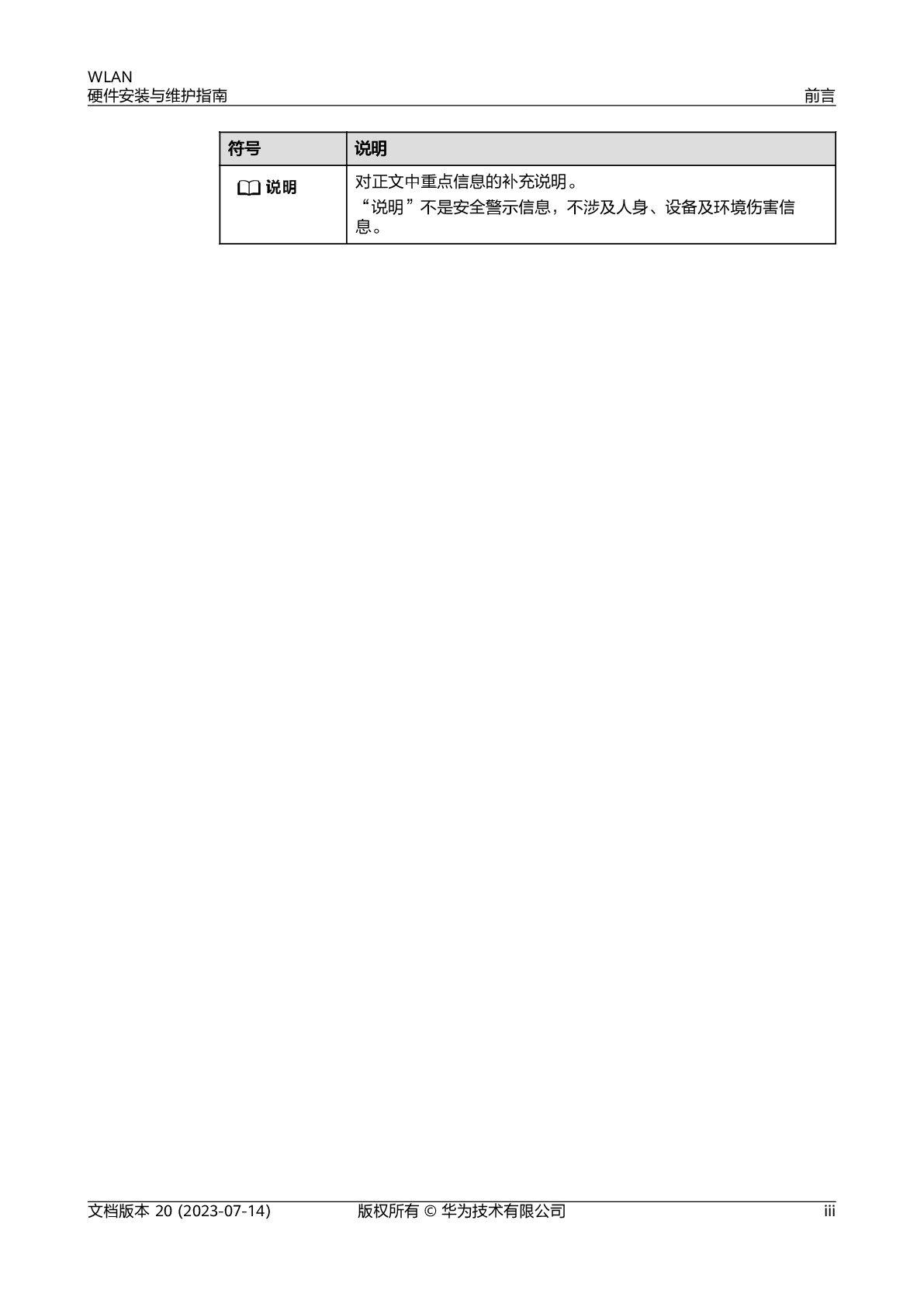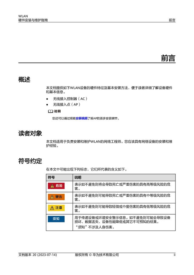 读者对象 本文档适用于负责安装和维护WLAN的网络工程师。您应该具有网络设备的安装和维 护经验。 符号约定 在本文中可能出现下列标志,它们所代表的含义如下。 符号 说明 表示如不避免则将会导致死亡或严重伤害的具有高等级风险的危 害。 表示如不避免则可能导致死亡或严重伤害的具有中等级风险的危 害。 表示如不避免则可能导致轻微或中度伤害的具有低等级风险的危 害。 用于传递设备或环境安全警示信息。如不避免则可能会导致设备 损坏、数据丢失、设备性能降低或其它不可预知的结果。 “须知”不涉及人身伤害。 WLAN 硬件安装与维护指南 前言 文档版本 20 (2023-07-14) 版权所有 © 华为技术有限公司 ii