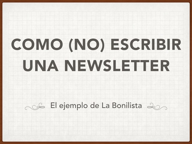 SE REDACTA LA BONILISTA • Objetivo de 500 palabras máximo. • 6 bloques: Intro + Nudo + Dibujo + Trama + Desenlace + Outro • Siempre escribo primero el Outro, para tener claro a dónde quiero llegar. • Lo siguiente que escribo es el título/asunto del correo. No me importa invertir tiempo en el mismo, ni me avergüenza hacerlo lo más llamativo posible. • Siempre busco abrir un debate, no dictar sentencias o juicios de valor. • Ante la duda, recuerda: AQUÍ HEMOS VENIDO A JUGAR.