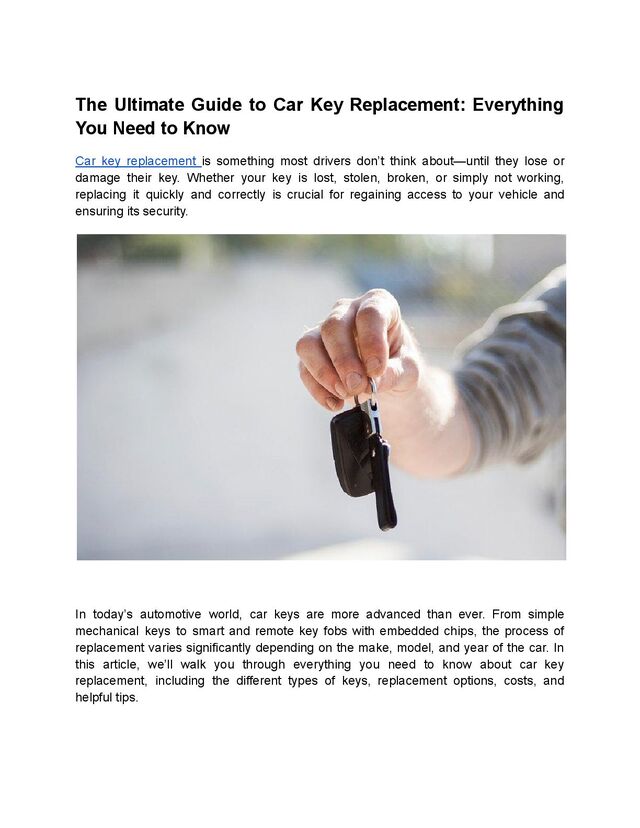 to Know Car key replacement is something most drivers don’t think about—until they lose or damage their key. Whether your key is lost, stolen, broken, or simply not working, replacing it quickly and correctly is crucial for regaining access to your vehicle and ensuring its security. In today’s automotive world, car keys are more advanced than ever. From simple mechanical keys to smart and remote key fobs with embedded chips, the process of replacement varies significantly depending on the make, model, and year of the car. In this article, we’ll walk you through everything you need to know about car key replacement, including the different types of keys, replacement options, costs, and helpful tips.