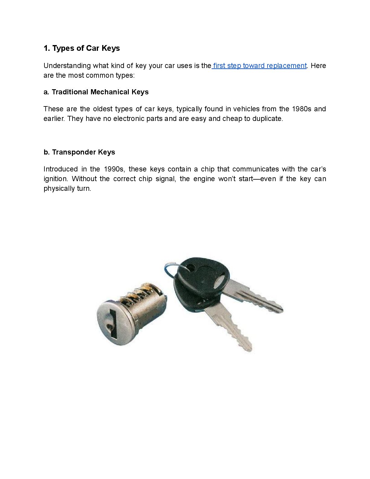 your car uses is the first step toward replacement. Here are the most common types: a. Traditional Mechanical Keys These are the oldest types of car keys, typically found in vehicles from the 1980s and earlier. They have no electronic parts and are easy and cheap to duplicate. b. Transponder Keys Introduced in the 1990s, these keys contain a chip that communicates with the car’s ignition. Without the correct chip signal, the engine won’t start—even if the key can physically turn.