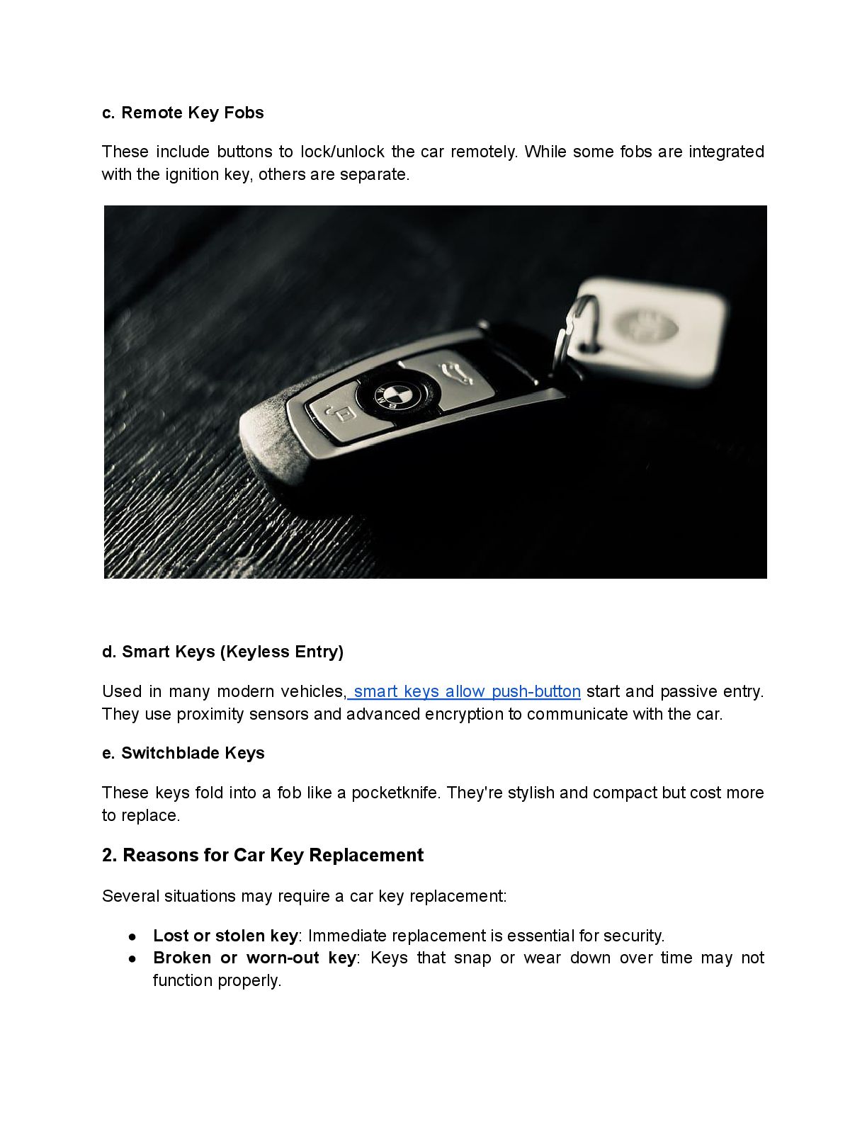 car remotely. While some fobs are integrated with the ignition key, others are separate. d. Smart Keys (Keyless Entry) Used in many modern vehicles, smart keys allow push-button start and passive entry. They use proximity sensors and advanced encryption to communicate with the car. e. Switchblade Keys These keys fold into a fob like a pocketknife. They're stylish and compact but cost more to replace. 2. Reasons for Car Key Replacement Several situations may require a car key replacement: • Lost or stolen key: Immediate replacement is essential for security. • Broken or worn-out key: Keys that snap or wear down over time may not function properly.