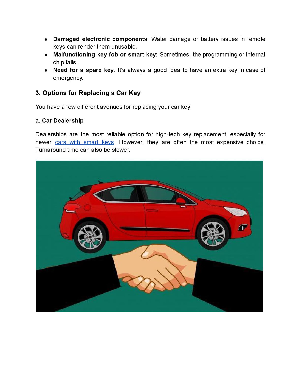 remote keys can render them unusable. • Malfunctioning key fob or smart key: Sometimes, the programming or internal chip fails. • Need for a spare key: It’s always a good idea to have an extra key in case of emergency. 3. Options for Replacing a Car Key You have a few different avenues for replacing your car key: a. Car Dealership Dealerships are the most reliable option for high-tech key replacement, especially for newer cars with smart keys. However, they are often the most expensive choice. Turnaround time can also be slower.