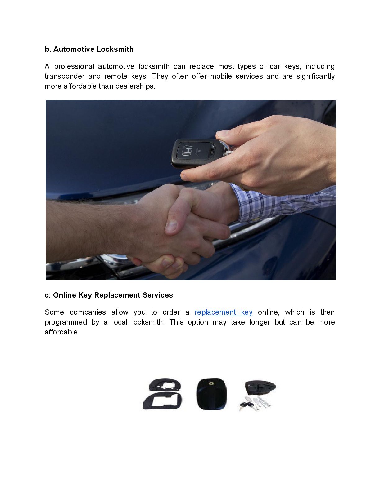 types of car keys, including transponder and remote keys. They often offer mobile services and are significantly more affordable than dealerships. c. Online Key Replacement Services Some companies allow you to order a replacement key online, which is then programmed by a local locksmith. This option may take longer but can be more affordable.