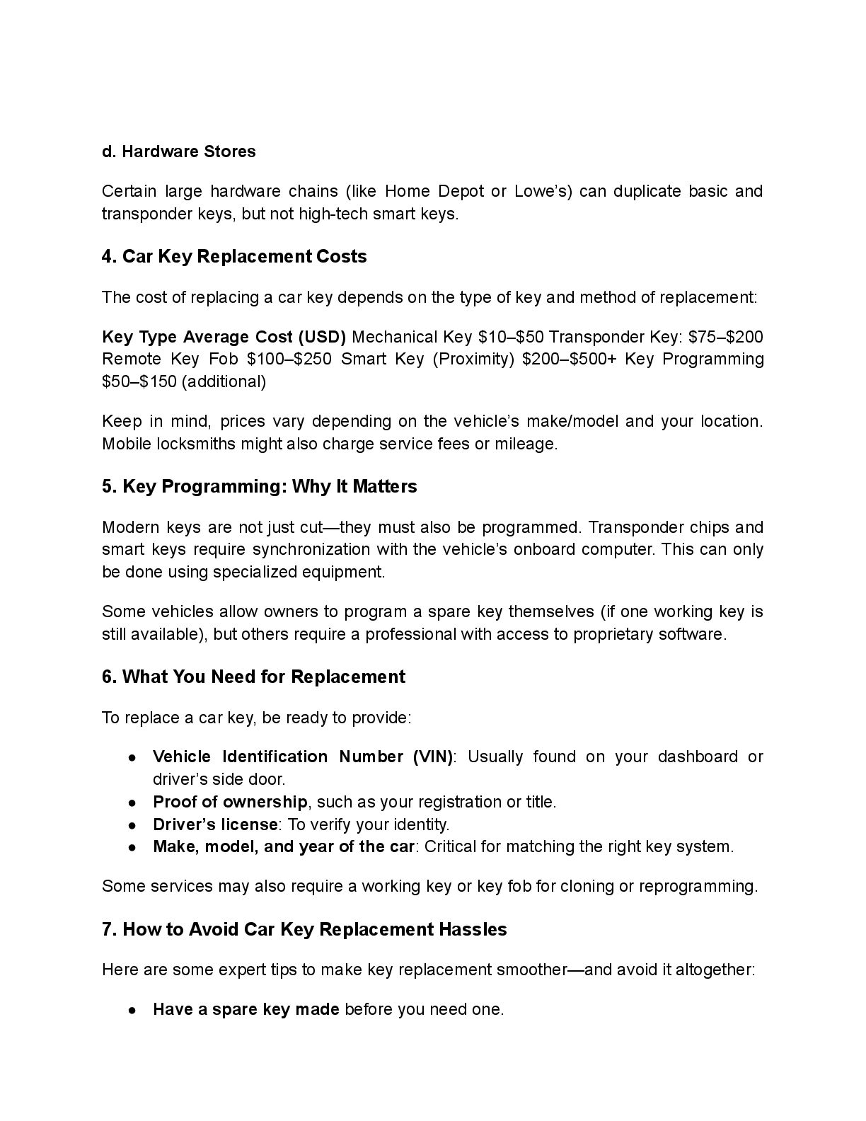 or Lowe’s) can duplicate basic and transponder keys, but not high-tech smart keys. 4. Car Key Replacement Costs The cost of replacing a car key depends on the type of key and method of replacement: Key Type Average Cost (USD) Mechanical Key $10–$50 Transponder Key: $75–$200 Remote Key Fob $100–$250 Smart Key (Proximity) $200–$500+ Key Programming $50–$150 (additional) Keep in mind, prices vary depending on the vehicle’s make/model and your location. Mobile locksmiths might also charge service fees or mileage. 5. Key Programming: Why It Matters Modern keys are not just cut—they must also be programmed. Transponder chips and smart keys require synchronization with the vehicle’s onboard computer. This can only be done using specialized equipment. Some vehicles allow owners to program a spare key themselves (if one working key is still available), but others require a professional with access to proprietary software. 6. What You Need for Replacement To replace a car key, be ready to provide: • Vehicle Identification Number (VIN): Usually found on your dashboard or driver’s side door. • Proof of ownership, such as your registration or title. • Driver’s license: To verify your identity. • Make, model, and year of the car: Critical for matching the right key system. Some services may also require a working key or key fob for cloning or reprogramming. 7. How to Avoid Car Key Replacement Hassles Here are some expert tips to make key replacement smoother—and avoid it altogether: • Have a spare key made before you need one.