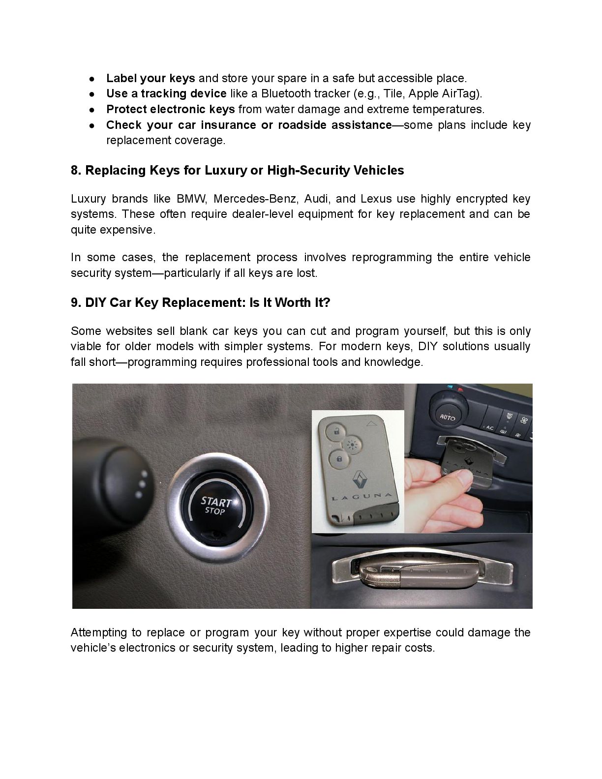 safe but accessible place. • Use a tracking device like a Bluetooth tracker (e.g., Tile, Apple AirTag). • Protect electronic keys from water damage and extreme temperatures. • Check your car insurance or roadside assistance—some plans include key replacement coverage. 8. Replacing Keys for Luxury or High-Security Vehicles Luxury brands like BMW, Mercedes-Benz, Audi, and Lexus use highly encrypted key systems. These often require dealer-level equipment for key replacement and can be quite expensive. In some cases, the replacement process involves reprogramming the entire vehicle security system—particularly if all keys are lost. 9. DIY Car Key Replacement: Is It Worth It? Some websites sell blank car keys you can cut and program yourself, but this is only viable for older models with simpler systems. For modern keys, DIY solutions usually fall short—programming requires professional tools and knowledge. Attempting to replace or program your key without proper expertise could damage the vehicle’s electronics or security system, leading to higher repair costs.