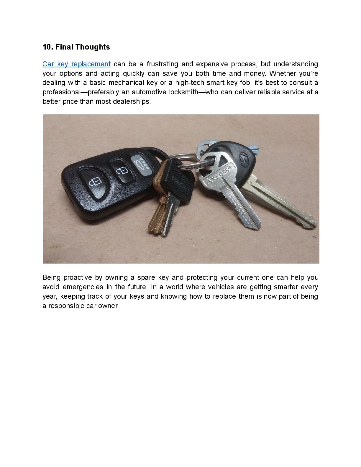 and expensive process, but understanding your options and acting quickly can save you both time and money. Whether you’re dealing with a basic mechanical key or a high-tech smart key fob, it’s best to consult a professional—preferably an automotive locksmith—who can deliver reliable service at a better price than most dealerships. Being proactive by owning a spare key and protecting your current one can help you avoid emergencies in the future. In a world where vehicles are getting smarter every year, keeping track of your keys and knowing how to replace them is now part of being a responsible car owner.
