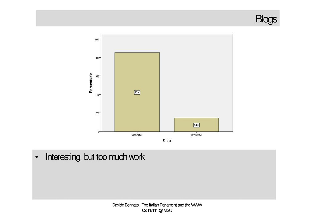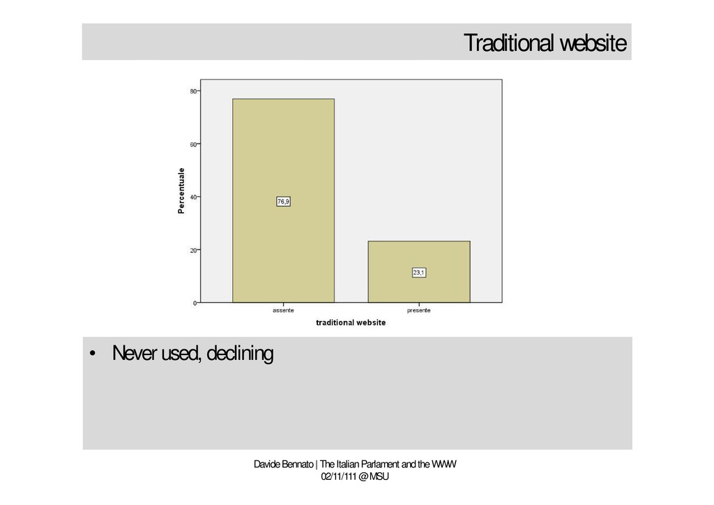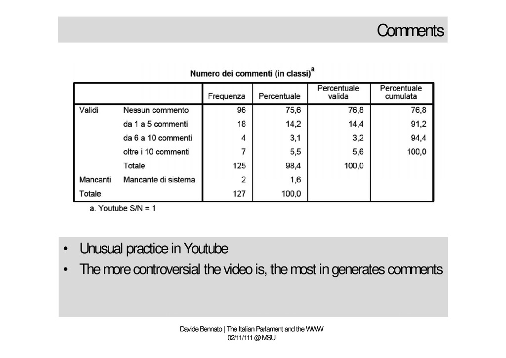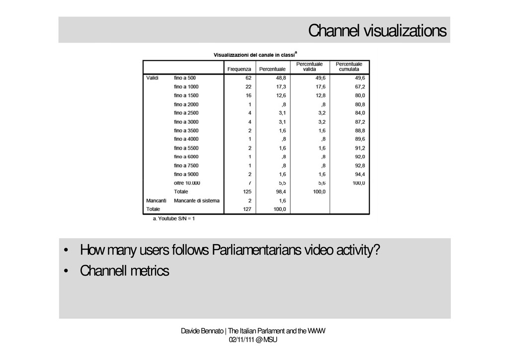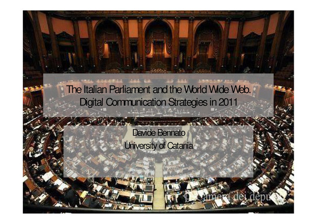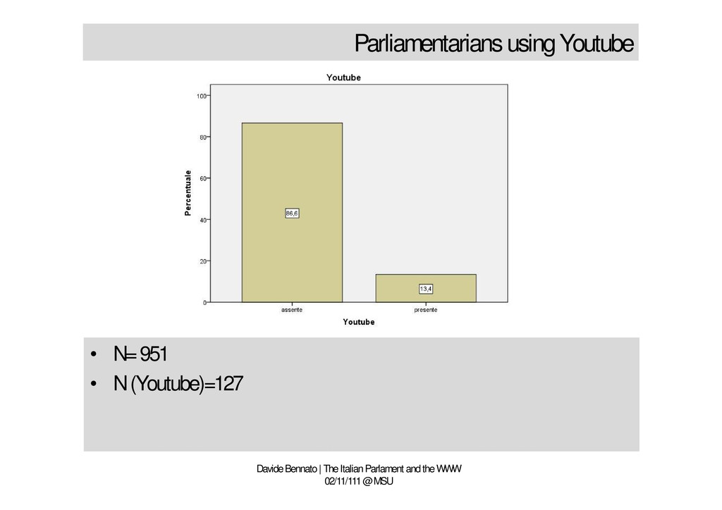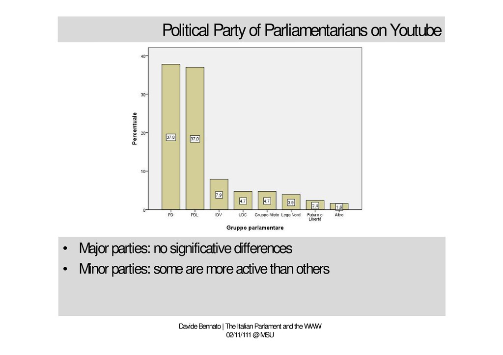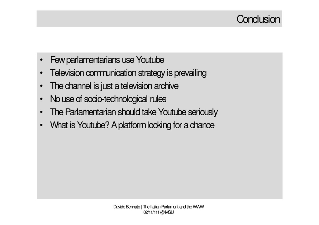 is prevailing • The channel is just a television archive • No use of socio-technological rules • The Parlamentarian should take Youtube seriously • What is Youtube? A platform looking for a chance Davide Bennato | The Italian Parlament and the WWW 02/11/111 @ MSU • Few parlamentarians use Youtube • Television communication strategy is prevailing • The channel is just a television archive • No use of socio-technological rules • The Parlamentarian should take Youtube seriously • What is Youtube? A platform looking for a chance
