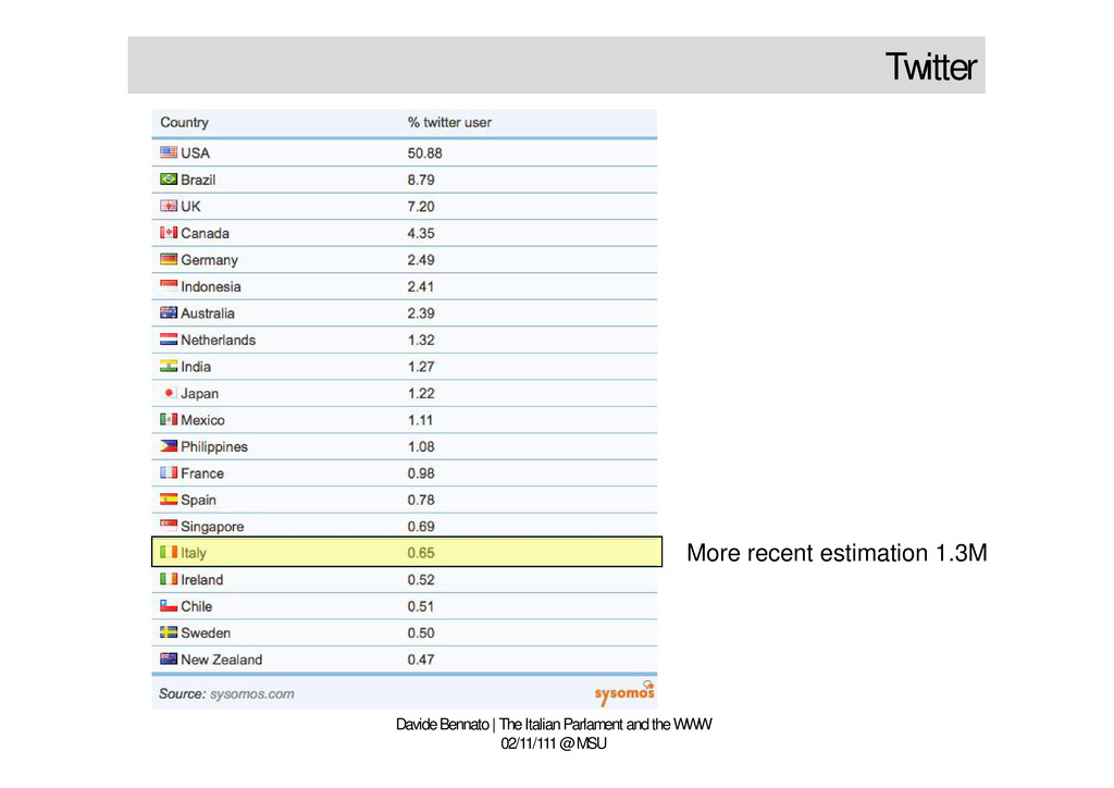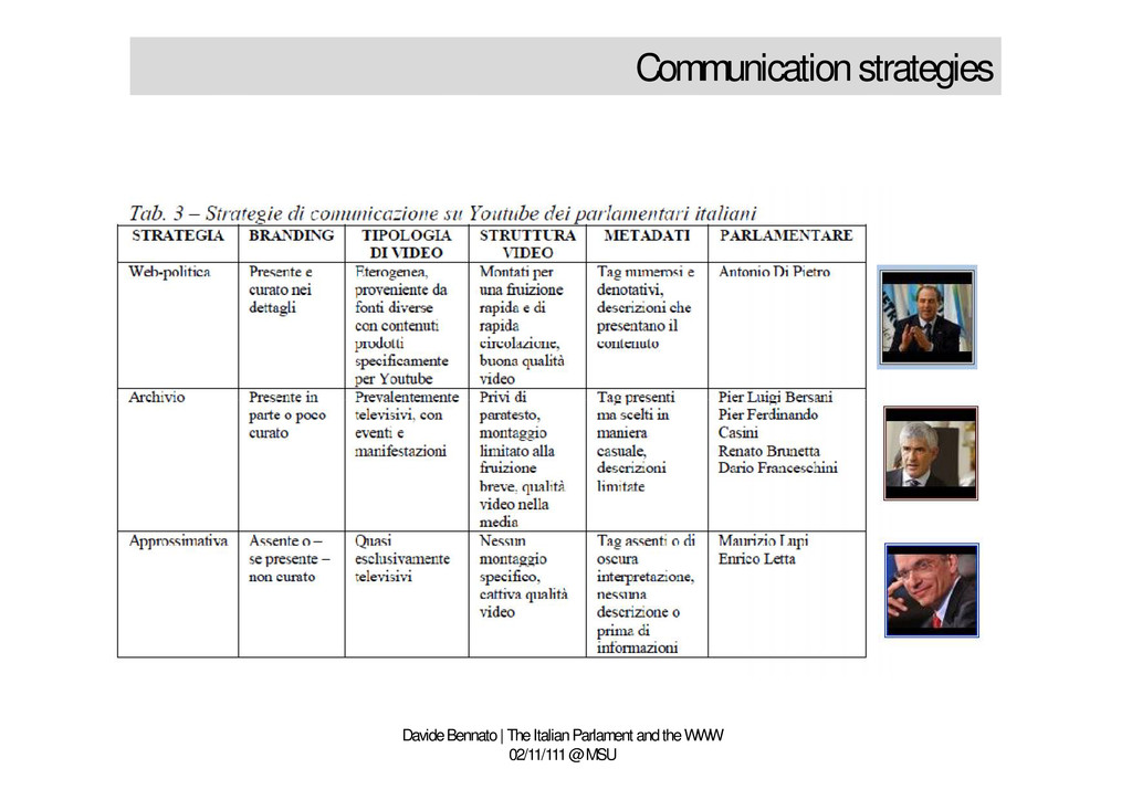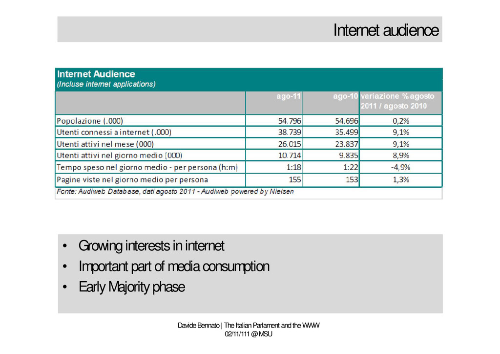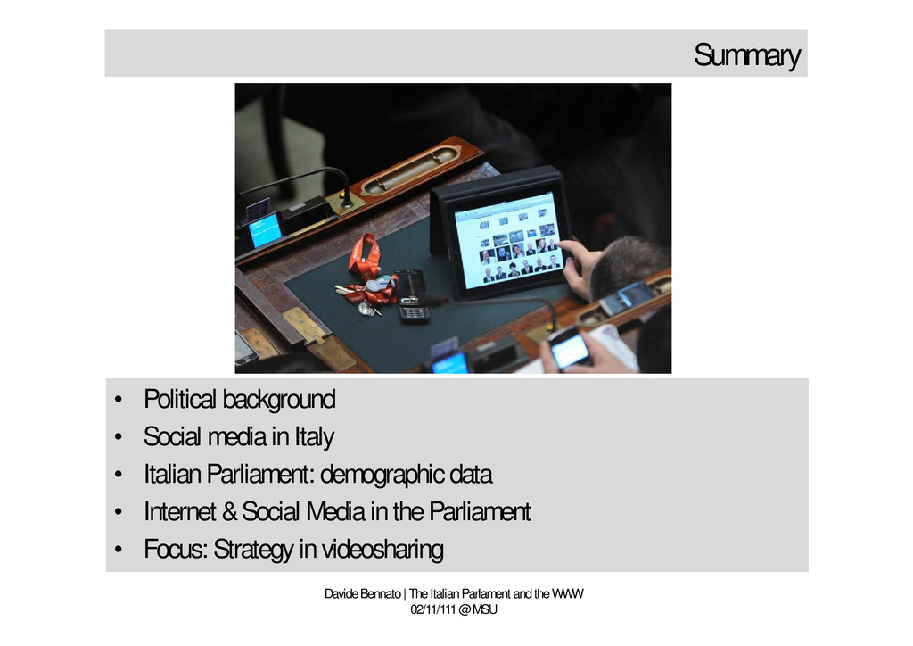 02/11/111 @ MSU • Political background • Social media in Italy • Italian Parliament: demographic data • Internet & Social Media in the Parliament • Focus: Strategy in videosharing