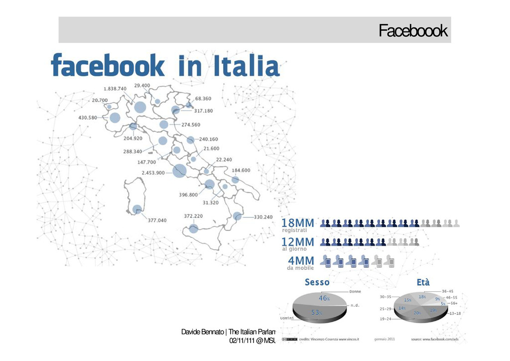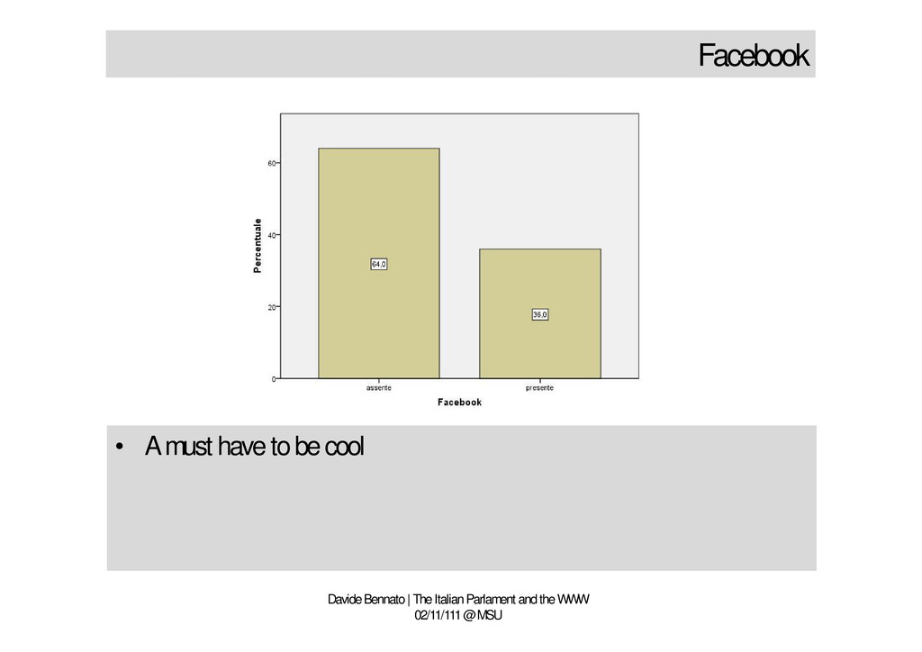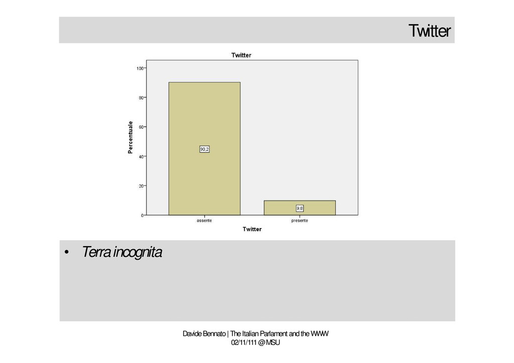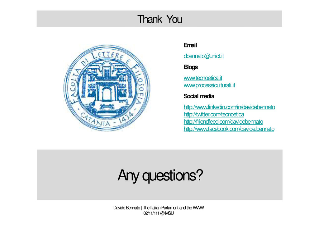 http://twitter.com/tecnoetica http://friendfeed.com/davidebennato http://www.facebook.com/davide.bennato Davide Bennato | The Italian Parlament and the WWW 02/11/111 @ MSU Email [email protected] Blogs www.tecnoetica.it www.processiculturali.it Social media http://www.linkedin.com/in/davidebennato http://twitter.com/tecnoetica http://friendfeed.com/davidebennato http://www.facebook.com/davide.bennato Any questions?