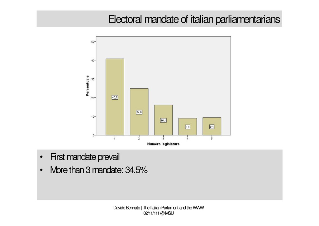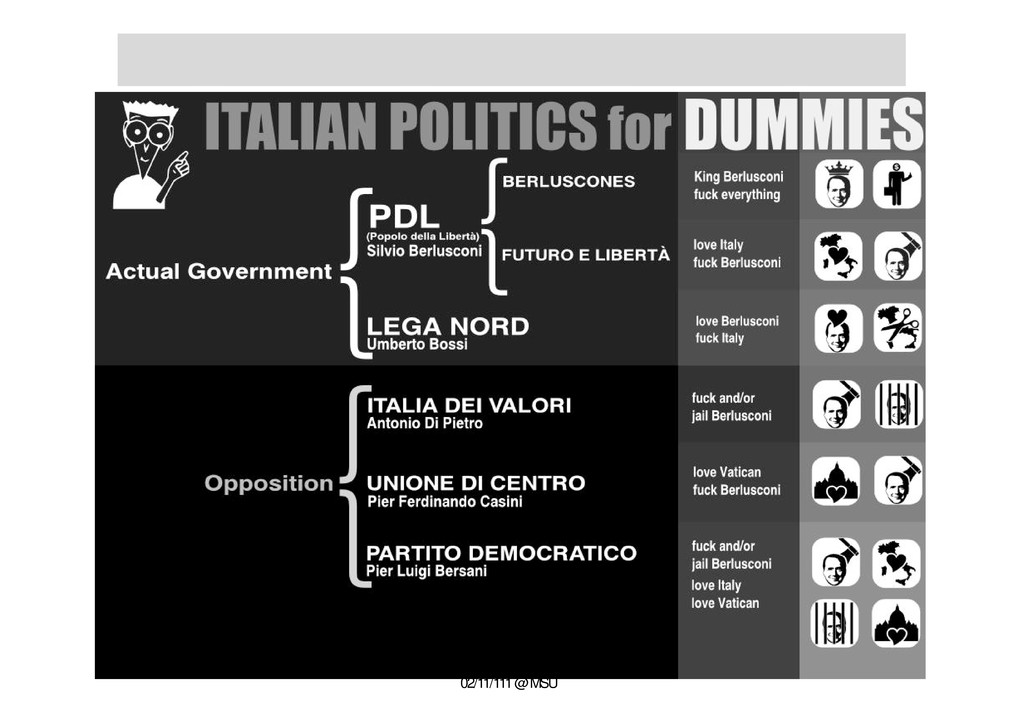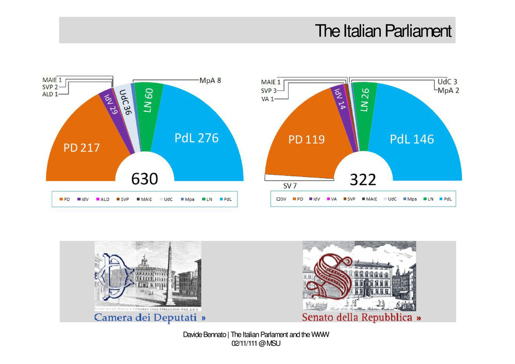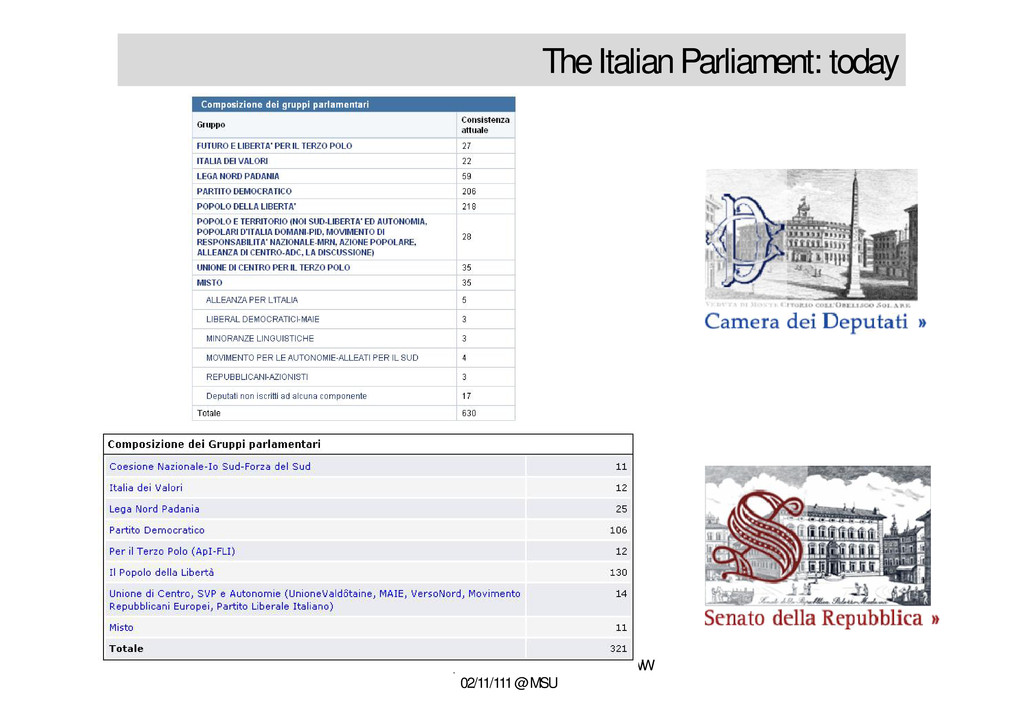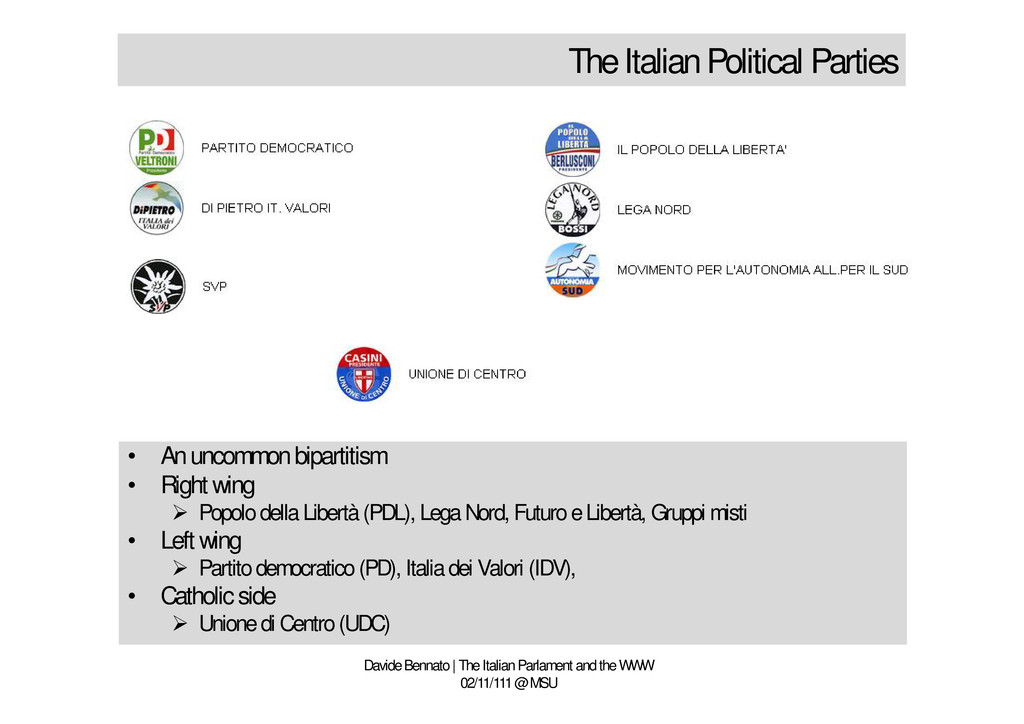and the WWW 02/11/111 @ MSU • An uncommon bipartitism • Right wing Popolo della Libertà (PDL), Lega Nord, Futuro e Libertà, Gruppi misti • Left wing Partito democratico (PD), Italia dei Valori (IDV), • Catholic side Unione di Centro (UDC)