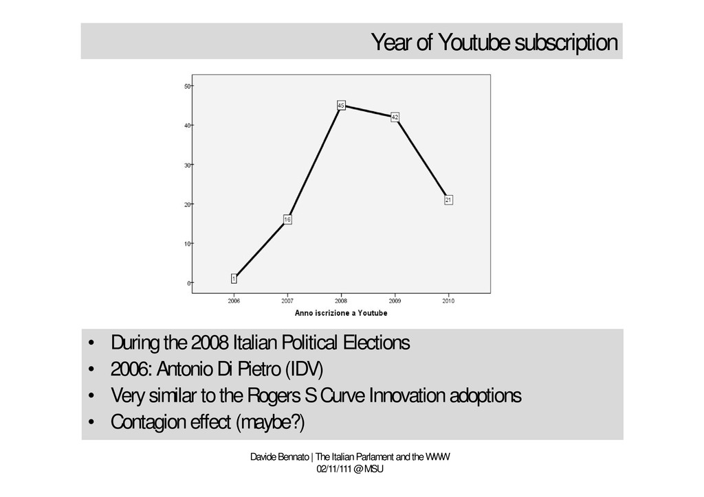 and the WWW 02/11/111 @ MSU • During the 2008 Italian Political Elections • 2006: Antonio Di Pietro (IDV) • Very similar to the Rogers S Curve Innovation adoptions • Contagion effect (maybe?)
