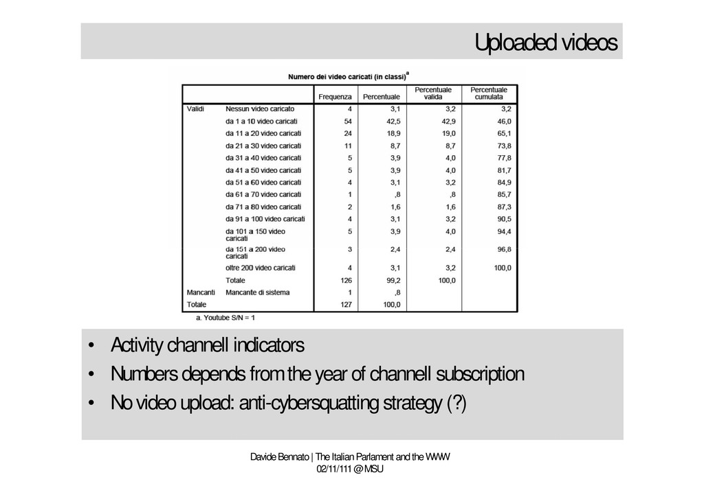 WWW 02/11/111 @ MSU • Activity channell indicators • Numbers depends from the year of channell subscription • No video upload: anti-cybersquatting strategy (?)