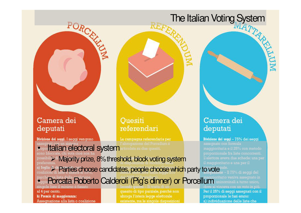 and the WWW 02/11/111 @ MSU • Italian electoral system Majority prize, 8% threshold, block voting system Parties choose candidates, people choose which party to vote • Porcata Roberto Calderoli (Pig’s dinner) or Porcellum