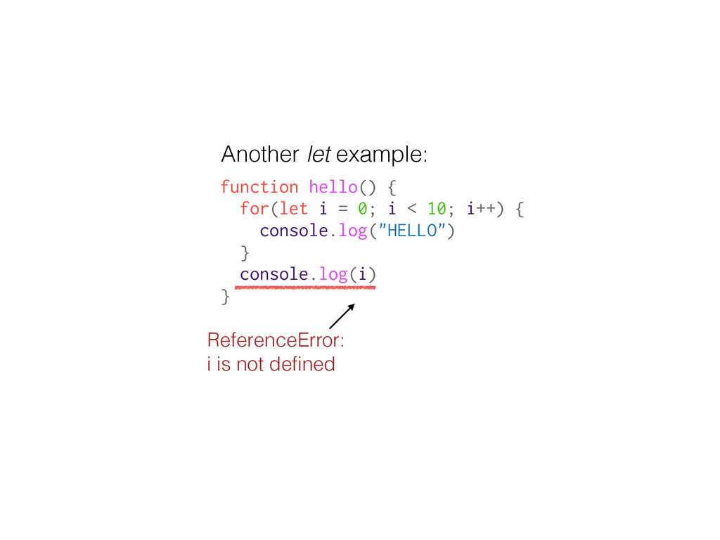 let text = "HELLO" } console.log(text) } ReferenceError: text is not defined function hello() { if(true) { var text = "HELLO" } console.log(text) } global scope or function scope This “works”, it prints “HELLO” Currently: