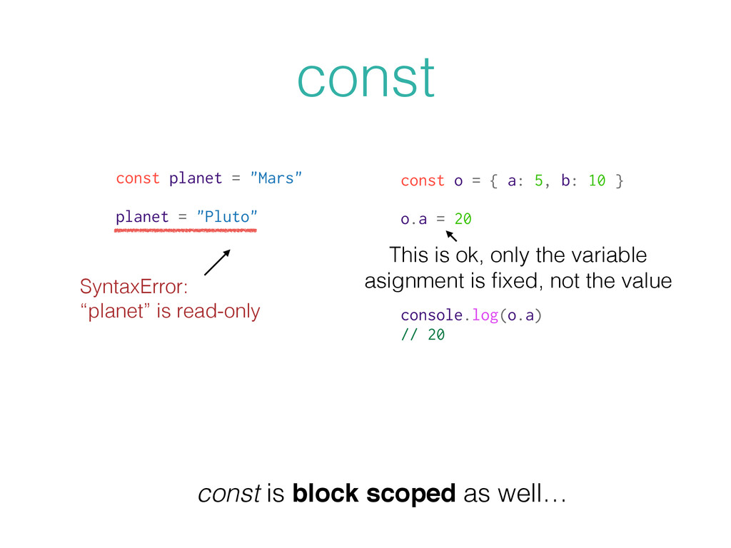 "Mars" planet = "Pluto" SyntaxError: “planet” is read-only const o = { a: 5, b: 10 } o.a = 20 console.log(o.a) // 20 This is ok, only the variable asignment is fixed, not the value