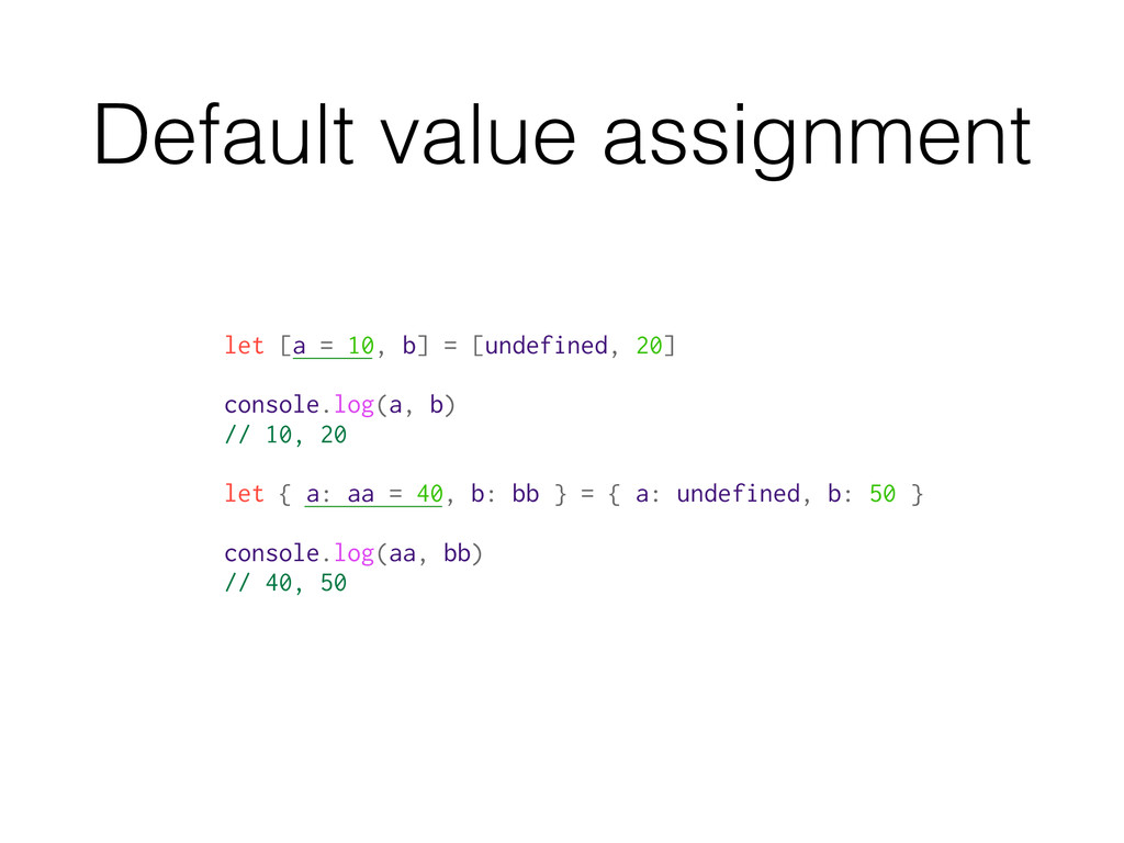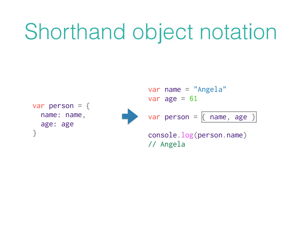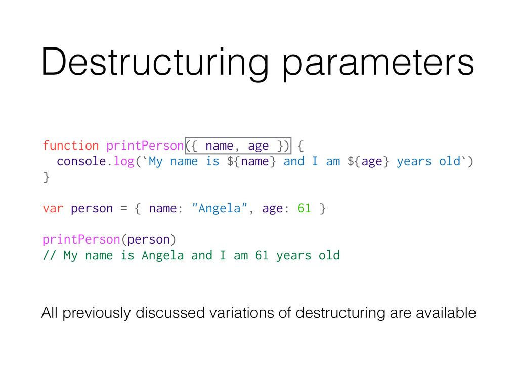 is ${name} and I am ${age} years old`) } var person = { name: "Angela", age: 61 } printPerson(person) // My name is Angela and I am 61 years old All previously discussed variations of destructuring are available