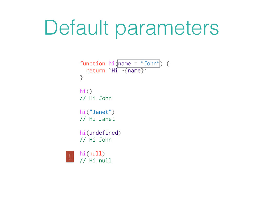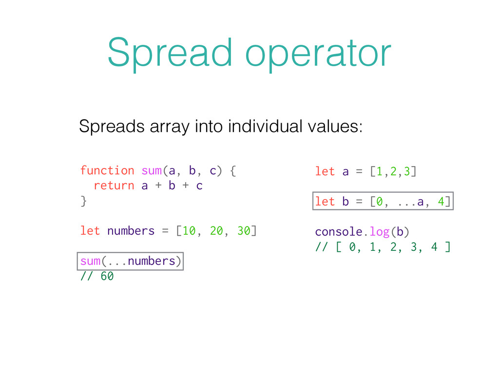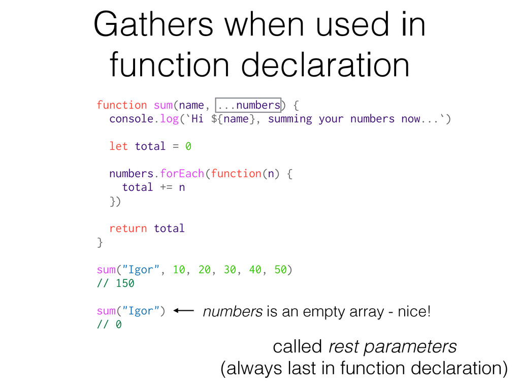 console.log(`Hi ${name}, summing your numbers now...`) let total = 0 numbers.forEach(function(n) { total += n }) return total } sum("Igor", 10, 20, 30, 40, 50) // 150 sum("Igor") // 0 called rest parameters (always last in function declaration) numbers is an empty array - nice!