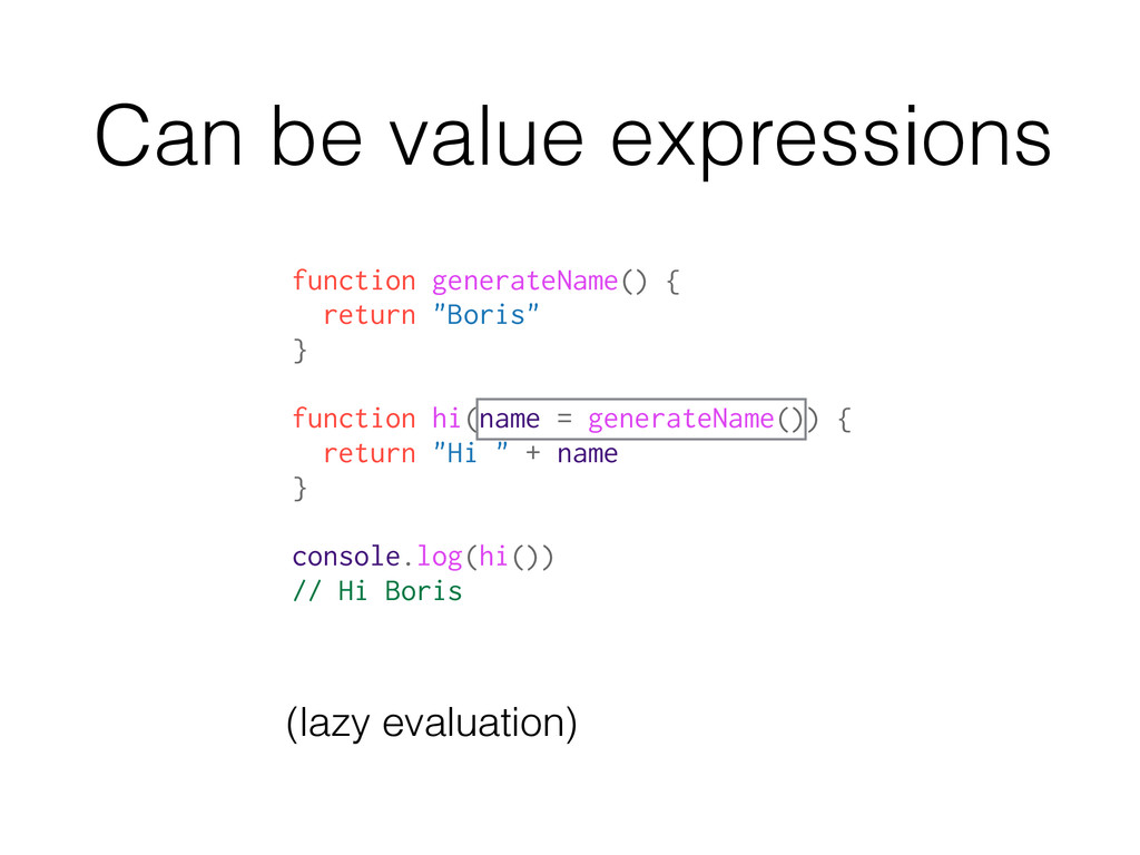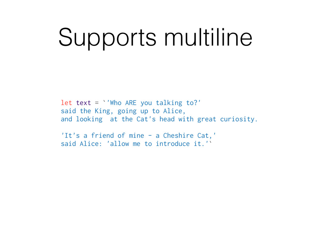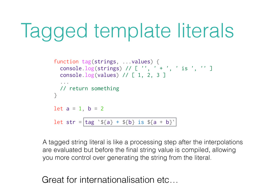 the interpolations are evaluated but before the final string value is compiled, allowing you more control over generating the string from the literal. Tagged template literals function tag(strings, ...values) { console.log(strings) // [ '', ' + ', ' is ', '' ] console.log(values) // [ 1, 2, 3 ] ... // return something } let a = 1, b = 2 let str = tag `${a} + ${b} is ${a + b}` Great for internationalisation etc…