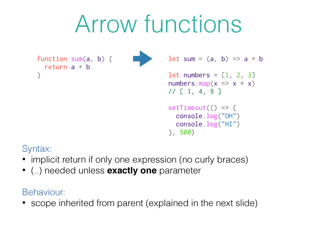 (no curly braces) • (..) needed unless exactly one parameter Behaviour: • scope inherited from parent (explained in the next slide) function sum(a, b) { return a + b } let sum = (a, b) => a + b let numbers = [1, 2, 3] numbers.map(x => x * x) // [ 1, 4, 9 ] setTimeout(() => { console.log("OH") console.log("HI") }, 500)
