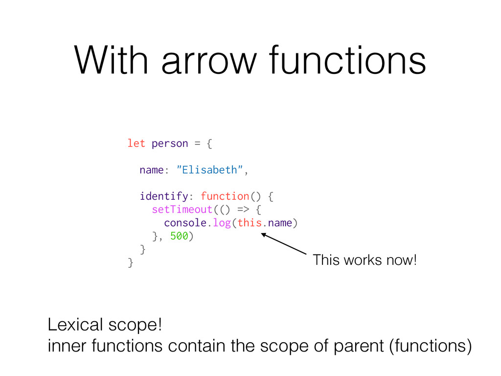 => { console.log(this.name) } } Fails because this is undefined (node.js) or window object (browser). Arrow function inherited global scope Lesson: not to be used everywhere, normal functions are fine for many purposes