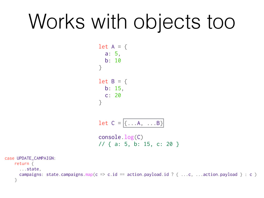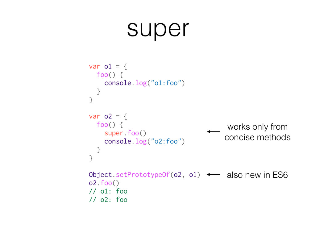 o2 = { foo() { super.foo() console.log("o2:foo") } } Object.setPrototypeOf(o2, o1) o2.foo() // o1: foo // o2: foo also new in ES6 works only from concise methods super
