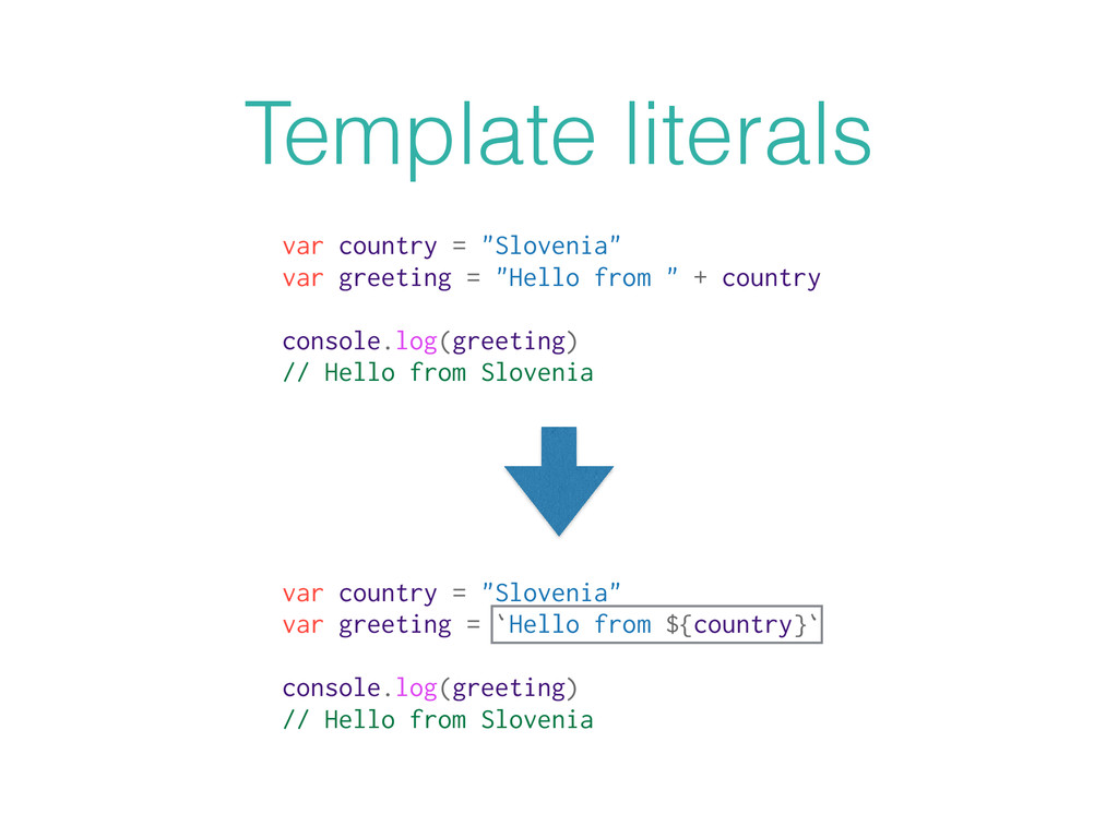 from " + country console.log(greeting) // Hello from Slovenia var country = "Slovenia" var greeting = `Hello from ${country}` console.log(greeting) // Hello from Slovenia