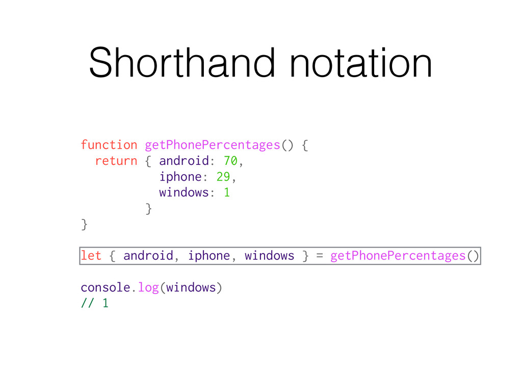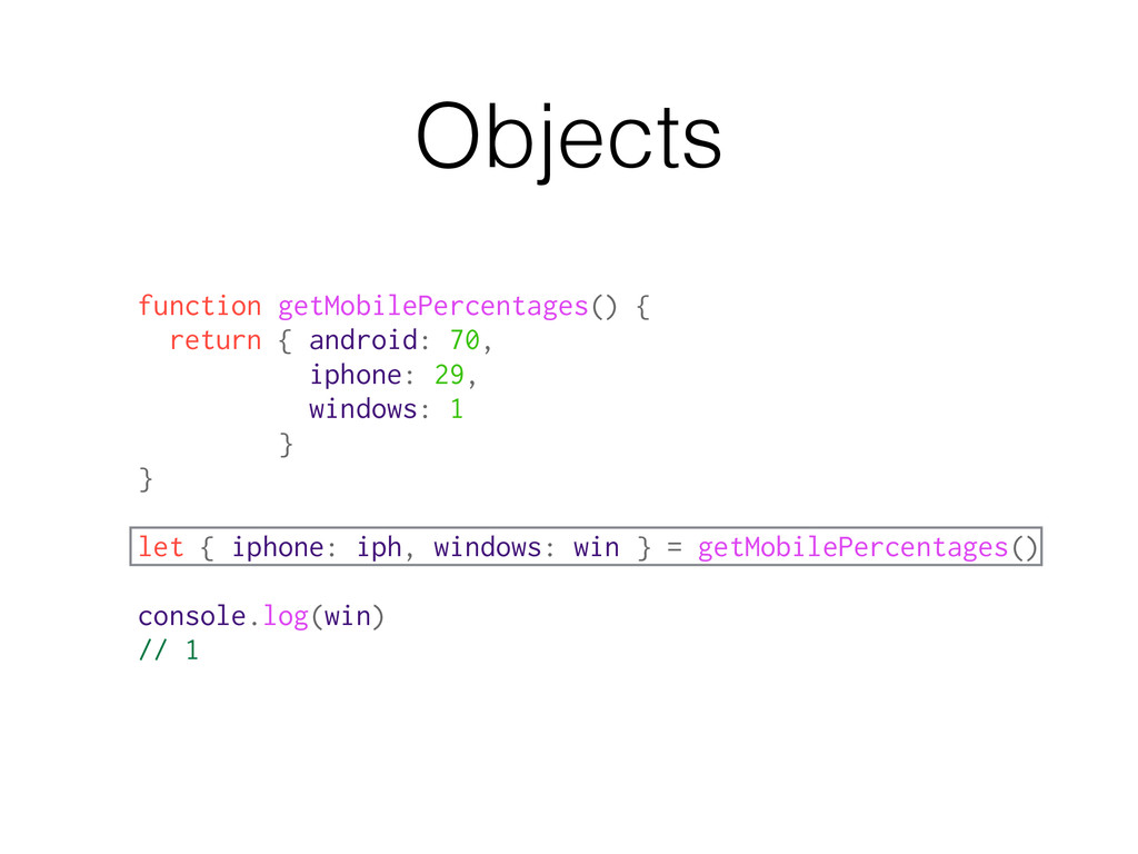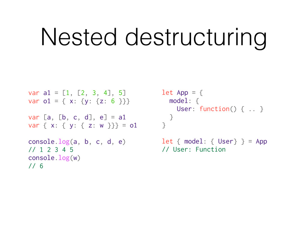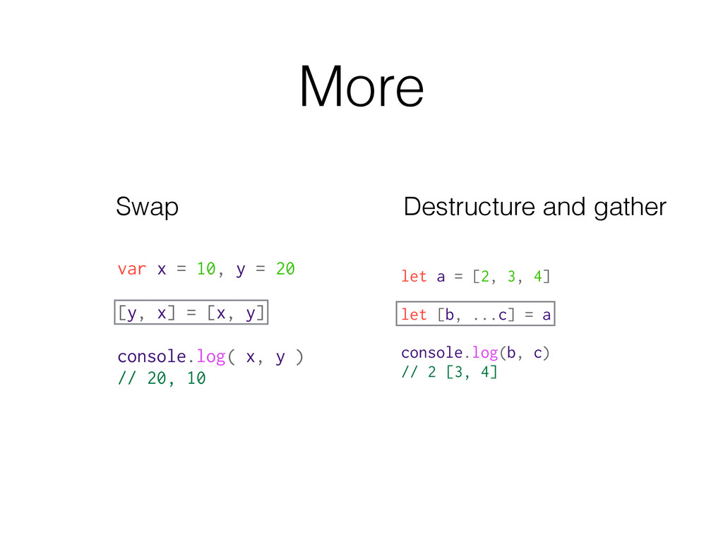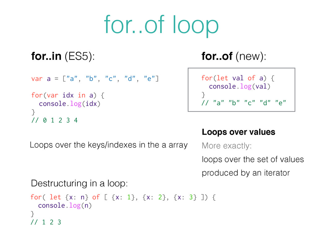 in a) { console.log(idx) } // 0 1 2 3 4 for..in (ES5): for..of loop Loops over the keys/indexes in the a array for(let val of a) { console.log(val) } // "a" "b" "c" "d" "e" for..of (new): Loops over values More exactly: loops over the set of values produced by an iterator for( let {x: n} of [ {x: 1}, {x: 2}, {x: 3} ]) { console.log(n) } // 1 2 3 Destructuring in a loop: