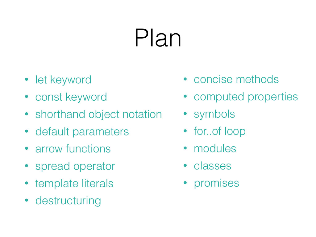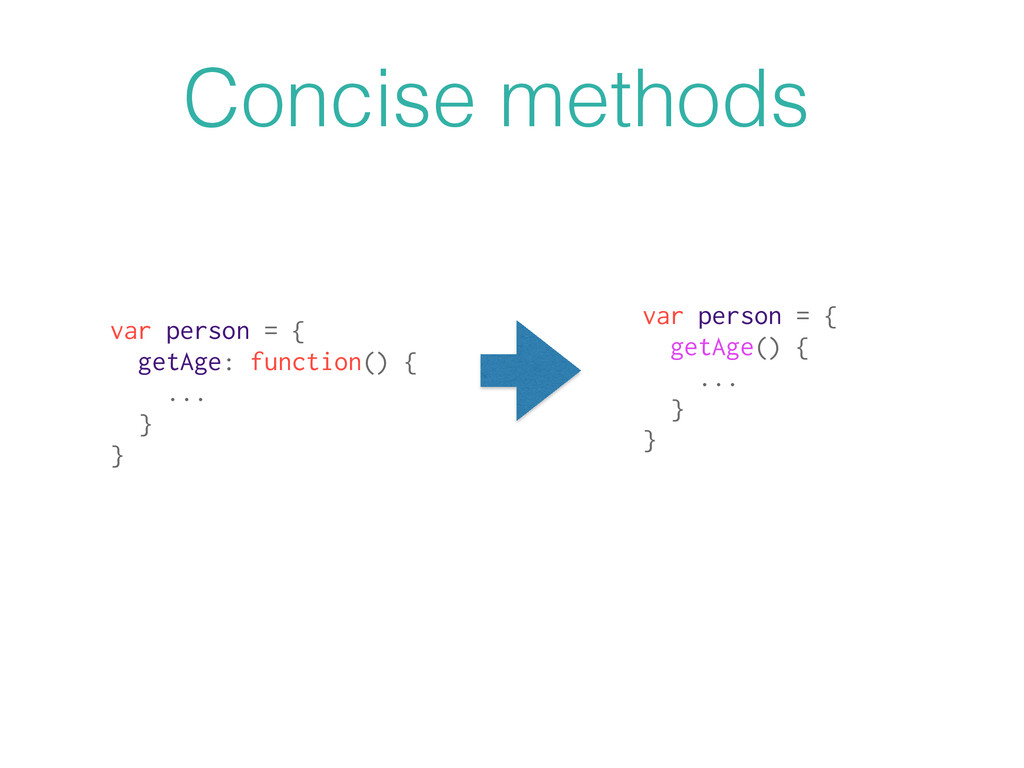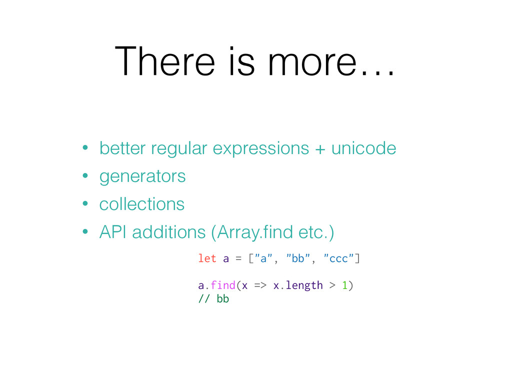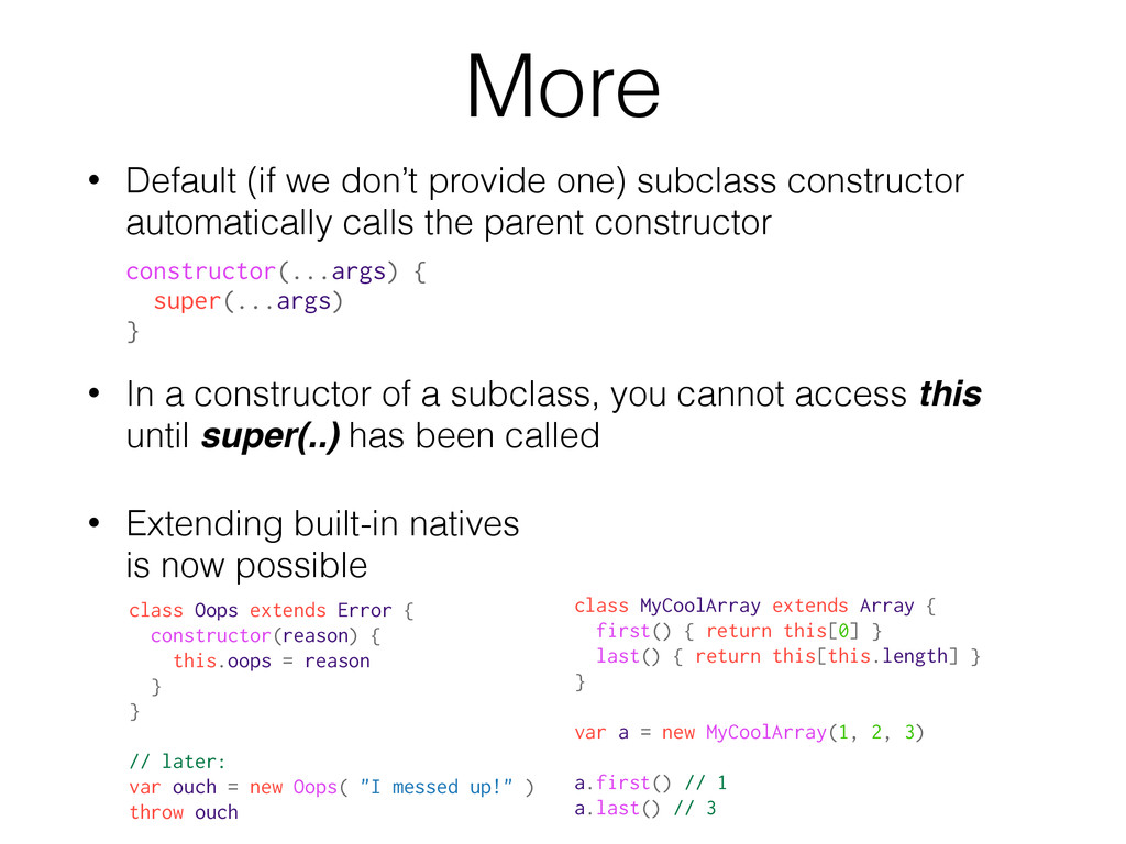 automatically calls the parent constructor • In a constructor of a subclass, you cannot access this until super(..) has been called • Extending built-in natives is now possible constructor(...args) { super(...args) } class MyCoolArray extends Array { first() { return this[0] } last() { return this[this.length] } } var a = new MyCoolArray(1, 2, 3) a.first() // 1 a.last() // 3 class Oops extends Error { constructor(reason) { this.oops = reason } } // later: var ouch = new Oops( "I messed up!" ) throw ouch