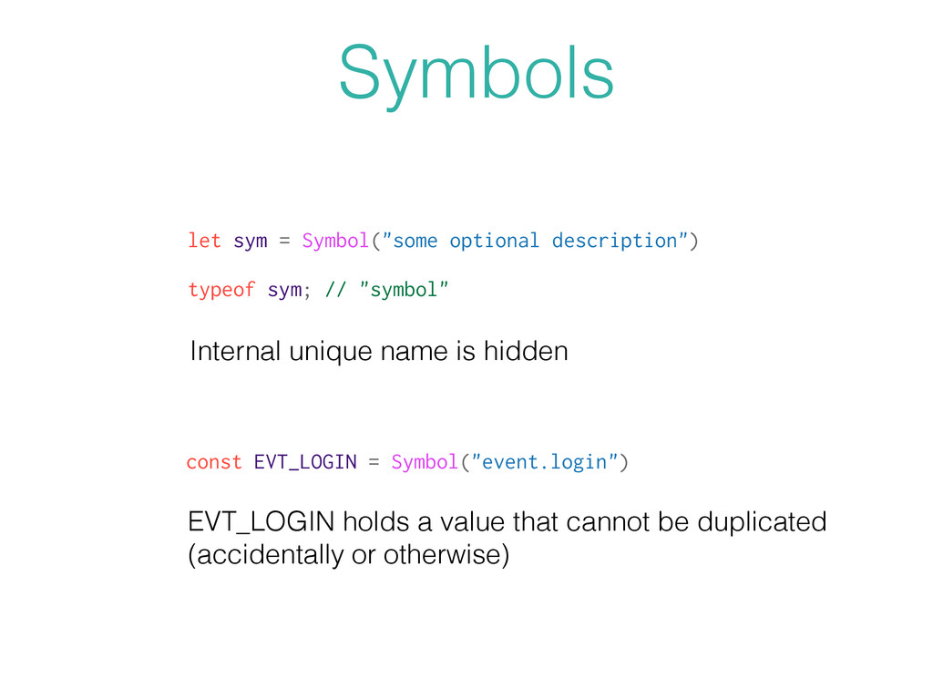 Symbols Internal unique name is hidden const EVT_LOGIN = Symbol("event.login") EVT_LOGIN holds a value that cannot be duplicated (accidentally or otherwise)