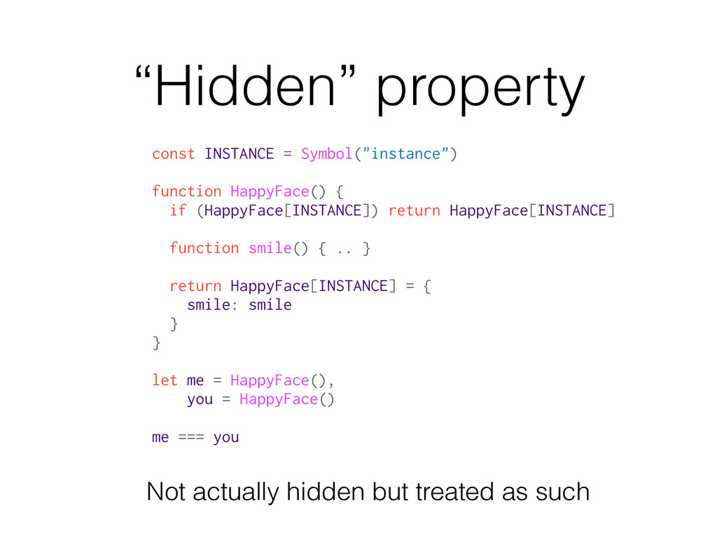 (HappyFace[INSTANCE]) return HappyFace[INSTANCE] function smile() { .. } return HappyFace[INSTANCE] = { smile: smile } } let me = HappyFace(), you = HappyFace() me === you Not actually hidden but treated as such
