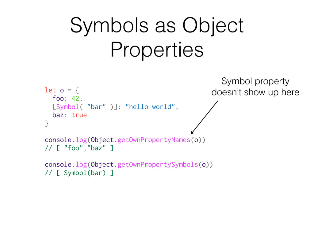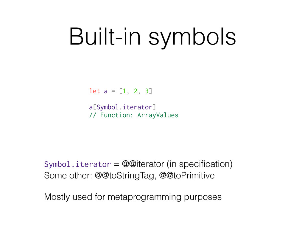 TypedArrays Plain objects are not by default suitable for for..of looping. That’s because they don’t have a default iterator, which is intentional, not a mistake. let a = [1, 2, 3] let iter = a[Symbol.iterator]() iter.next() // { value: 1, done: false } iter.next() // { value: 2, done: false } iter.next() // { value: 3, done: false } iter.next() // { value: undefined, done: true } for (let v, res; !(res = iter.next()) && !res.done) { v = res.value console.log(v) }