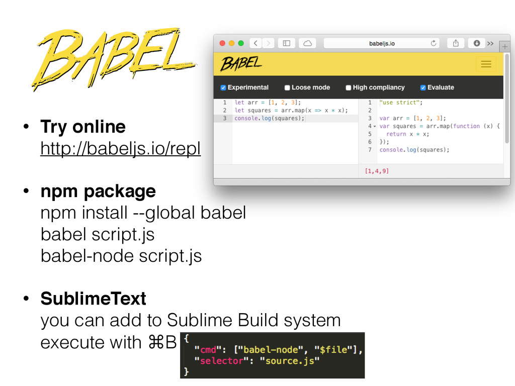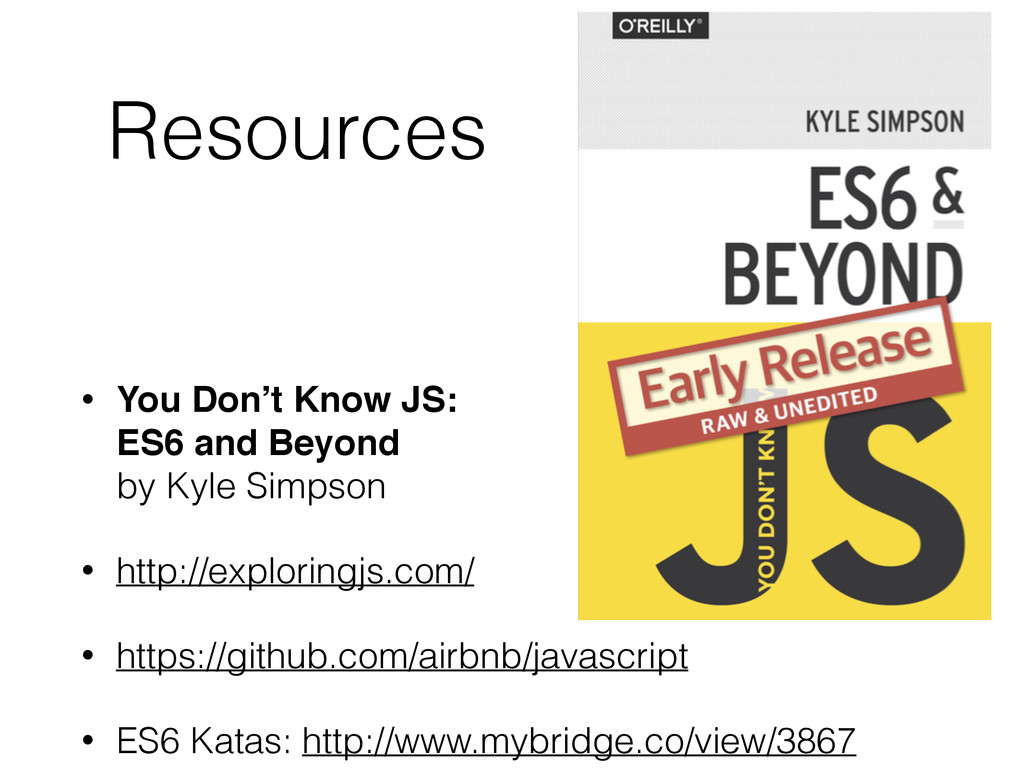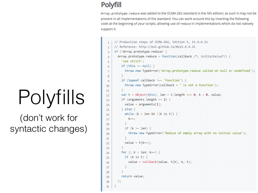 starts to be seen more as a living standard. • ESXXXX - new label, eg. ES2016 • Whatever labels that future JavaScript adopts, it’s going to move a lot quicker than it ever has before. Transpilers and shims/polyfills are important tools to keep you on the forefront of where the language is headed.