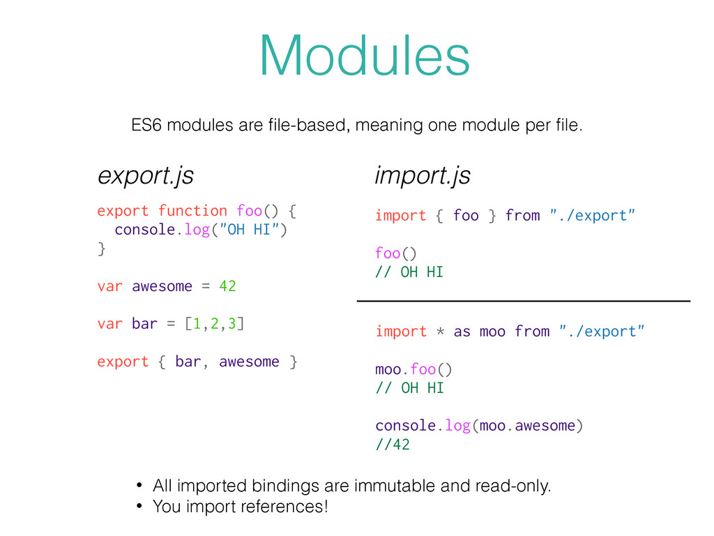 export function foo() { console.log("OH HI") } var awesome = 42 var bar = [1,2,3] export { bar, awesome } export.js import * as moo from "./export" moo.foo() // OH HI console.log(moo.awesome) //42 import { foo } from "./export" foo() // OH HI import.js • All imported bindings are immutable and read-only. • You import references!