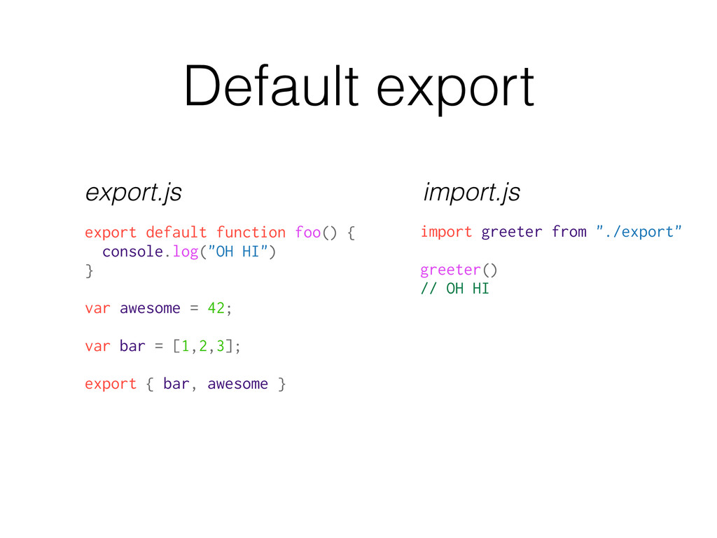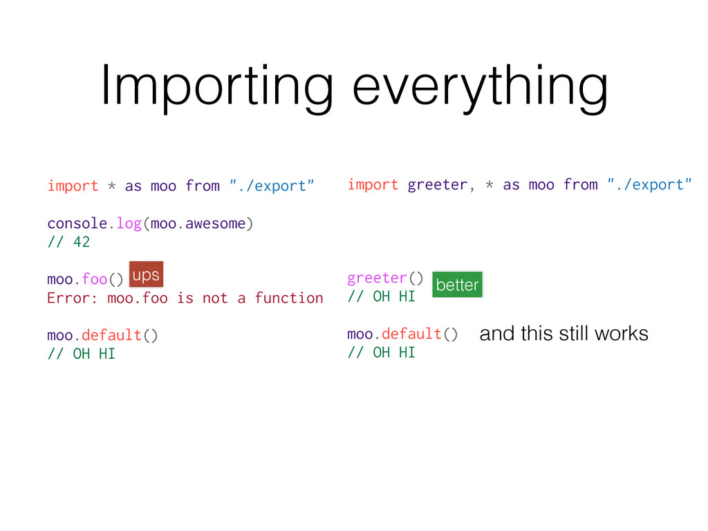 42 moo.foo() Error: moo.foo is not a function moo.default() // OH HI import greeter, * as moo from "./export" greeter() // OH HI moo.default() // OH HI ups better and this still works