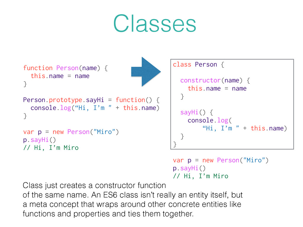 function() { console.log(“Hi, I’m " + this.name) } var p = new Person("Miro") p.sayHi() // Hi, I’m Miro class Person { constructor(name) { this.name = name } sayHi() { console.log( “Hi, I’m " + this.name) } } var p = new Person("Miro") p.sayHi() // Hi, I’m Miro Class just creates a constructor function of the same name. An ES6 class isn’t really an entity itself, but a meta concept that wraps around other concrete entities like functions and properties and ties them together.