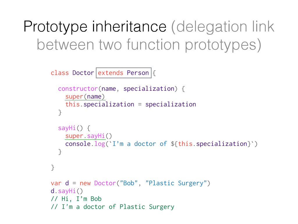 extends Person { constructor(name, specialization) { super(name) this.specialization = specialization } sayHi() { super.sayHi() console.log(`I’m a doctor of ${this.specialization}`) } } var d = new Doctor("Bob", "Plastic Surgery") d.sayHi() // Hi, I’m Bob // I'm a doctor of Plastic Surgery