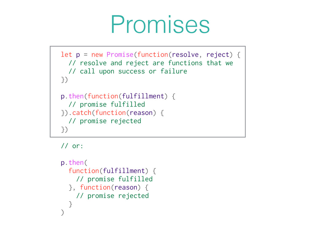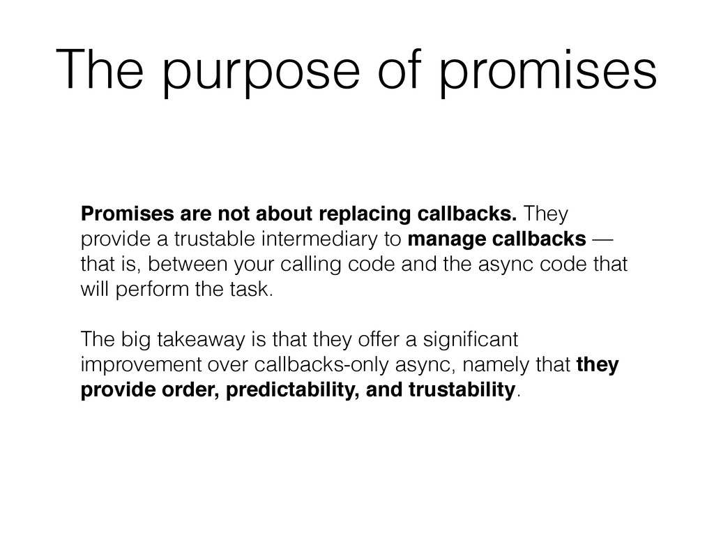 intermediary to manage callbacks — that is, between your calling code and the async code that will perform the task. The big takeaway is that they offer a significant improvement over callbacks-only async, namely that they provide order, predictability, and trustability. The purpose of promises