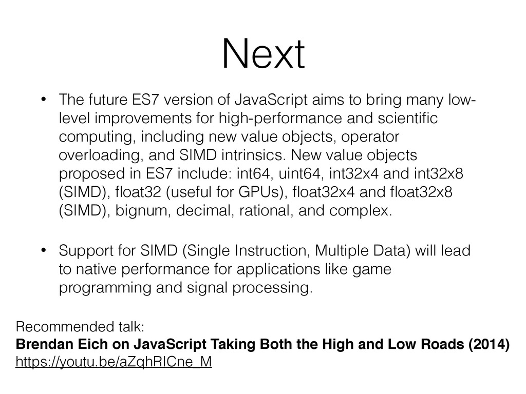 bring many low- level improvements for high-performance and scientific computing, including new value objects, operator overloading, and SIMD intrinsics. New value objects proposed in ES7 include: int64, uint64, int32x4 and int32x8 (SIMD), float32 (useful for GPUs), float32x4 and float32x8 (SIMD), bignum, decimal, rational, and complex. • Support for SIMD (Single Instruction, Multiple Data) will lead to native performance for applications like game programming and signal processing. Recommended talk: Brendan Eich on JavaScript Taking Both the High and Low Roads (2014) https://youtu.be/aZqhRICne_M