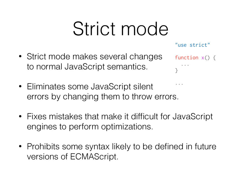 normal JavaScript semantics. • Eliminates some JavaScript silent errors by changing them to throw errors. • Fixes mistakes that make it difficult for JavaScript engines to perform optimizations. • Prohibits some syntax likely to be defined in future versions of ECMAScript. "use strict" function x() { ... } ...