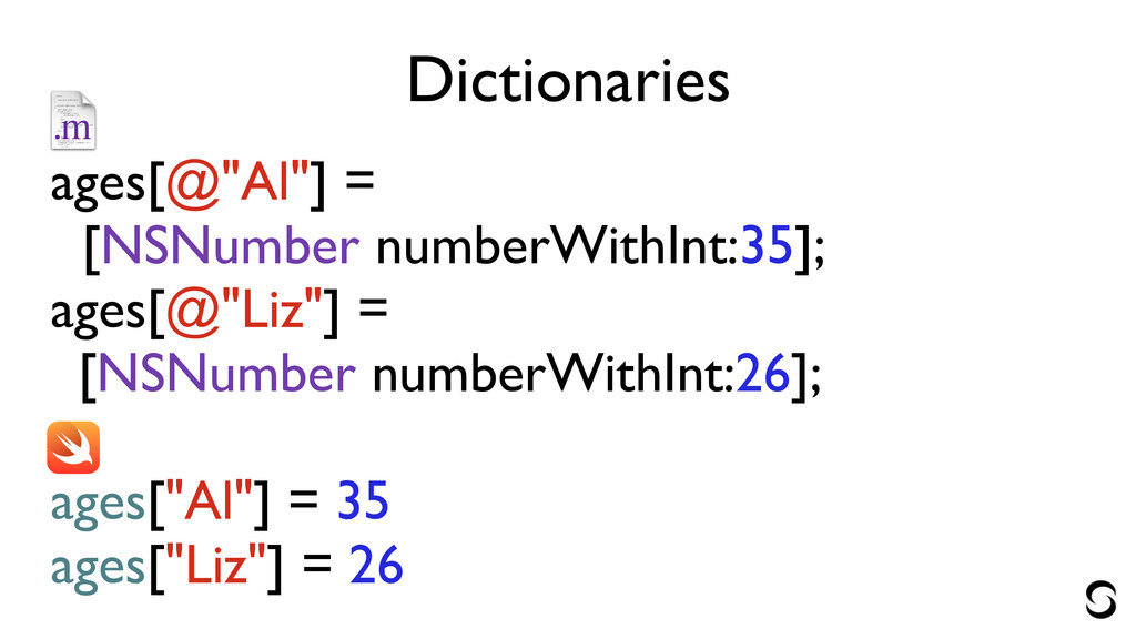 Dictionaries ages[@"Al"] = [NSNumber numberWithInt:35]; ages[@"Liz"] = [NSNumber numberWithInt:26]; !